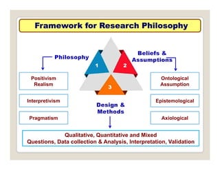 The document discusses the framework for research philosophy, outlining the distinctions between ontological, epistemological, and axiological assumptions in various research paradigms such as positivism, interpretivism, and pragmatism. It highlights the importance of data analysis in decision-making processes, explaining different types of data and analytical approaches, including descriptive, exploratory, diagnostic, predictive, and prescriptive analysis. The text emphasizes the challenges of data collection and analysis, underscoring the need for effective strategies to derive meaningful insights from data.