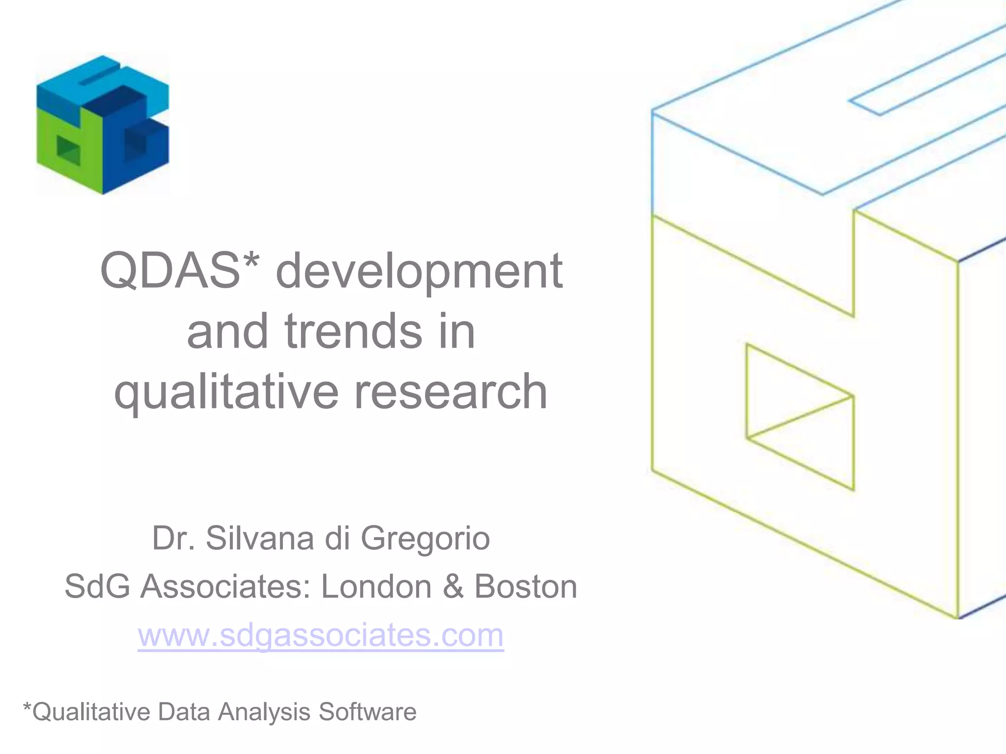 This document discusses the development of qualitative data analysis software (QDAS) and trends in qualitative research. It provides a historical overview of QDAS development from the 1980s to present day, tracing its evolution alongside the eight moments in qualitative research identified by Denzin and Lincoln. While QDAS aimed to support different forms of qualitative research, its use remained primarily confined to academic researchers. The document argues understanding the parallel but disconnected histories of QDAS and qualitative research can explain the slow acceptance of QDAS and calls for more collaboration between the two communities going forward.