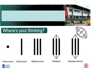 The document describes the SOLO (Structure of the Observed Learning Outcome) taxonomy, which categorizes levels of thinking into five categories: prestructural, unistructural, multistructural, relational, and extended abstract. Each category is defined by the type and complexity of thinking involved. For example, unistructural involves a single idea, multistructural combines multiple ideas, and relational links ideas together with comparisons and explanations. The document provides examples to illustrate the differences between the categories.
