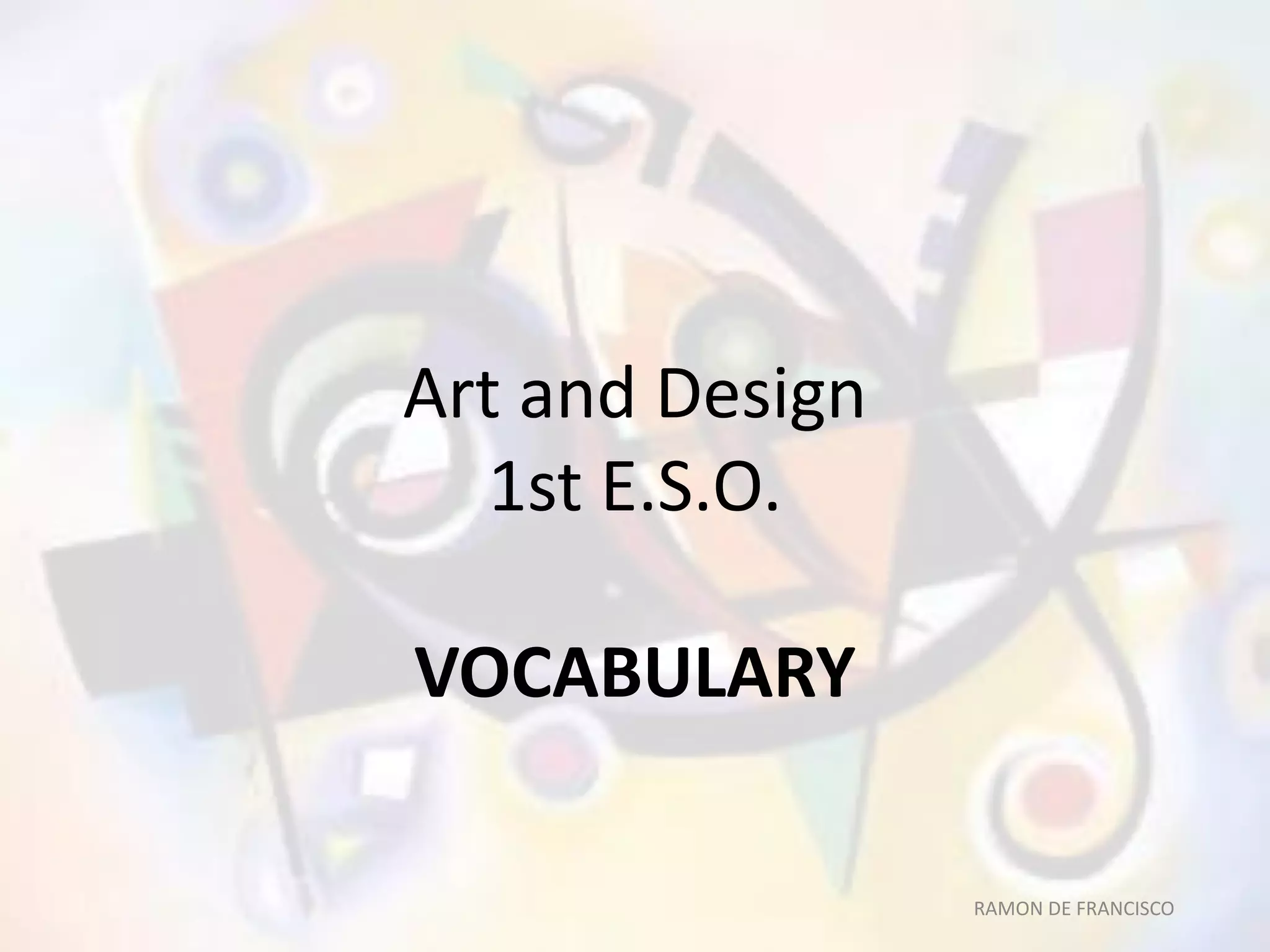 This document contains a vocabulary list for an Art and Design class. It lists 30 common art supplies used for drawing, painting, and organizing materials. The supplies include pencils, pens, erasers, rulers, protractors, glue, tape, paper clips, folders, notebooks, chalk, charcoal, pastels, crayons, colored pencils, gouache, watercolors, oil paints, brushes, and a palette. Brief biographies of Julian Beever, Edgar Degas, and Van Gogh are also mentioned.
