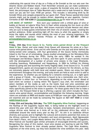 The document provides a list of current and upcoming wine and food-related events in 2012, including art exhibitions, wine tastings, wine dinners and festivals in South Africa and abroad. Details such as dates, locations, descriptions and contact information are provided for each event. The list will be regularly updated with new events.