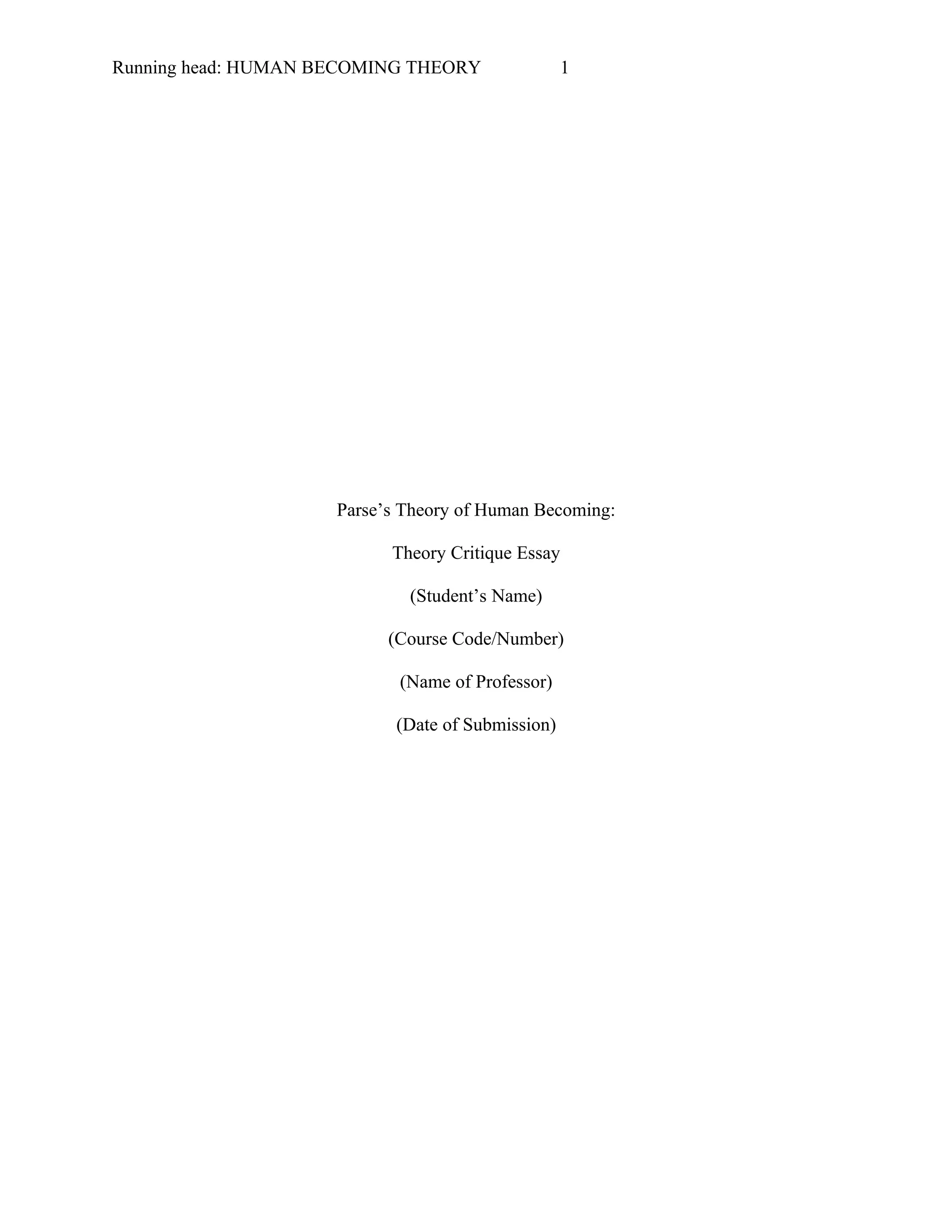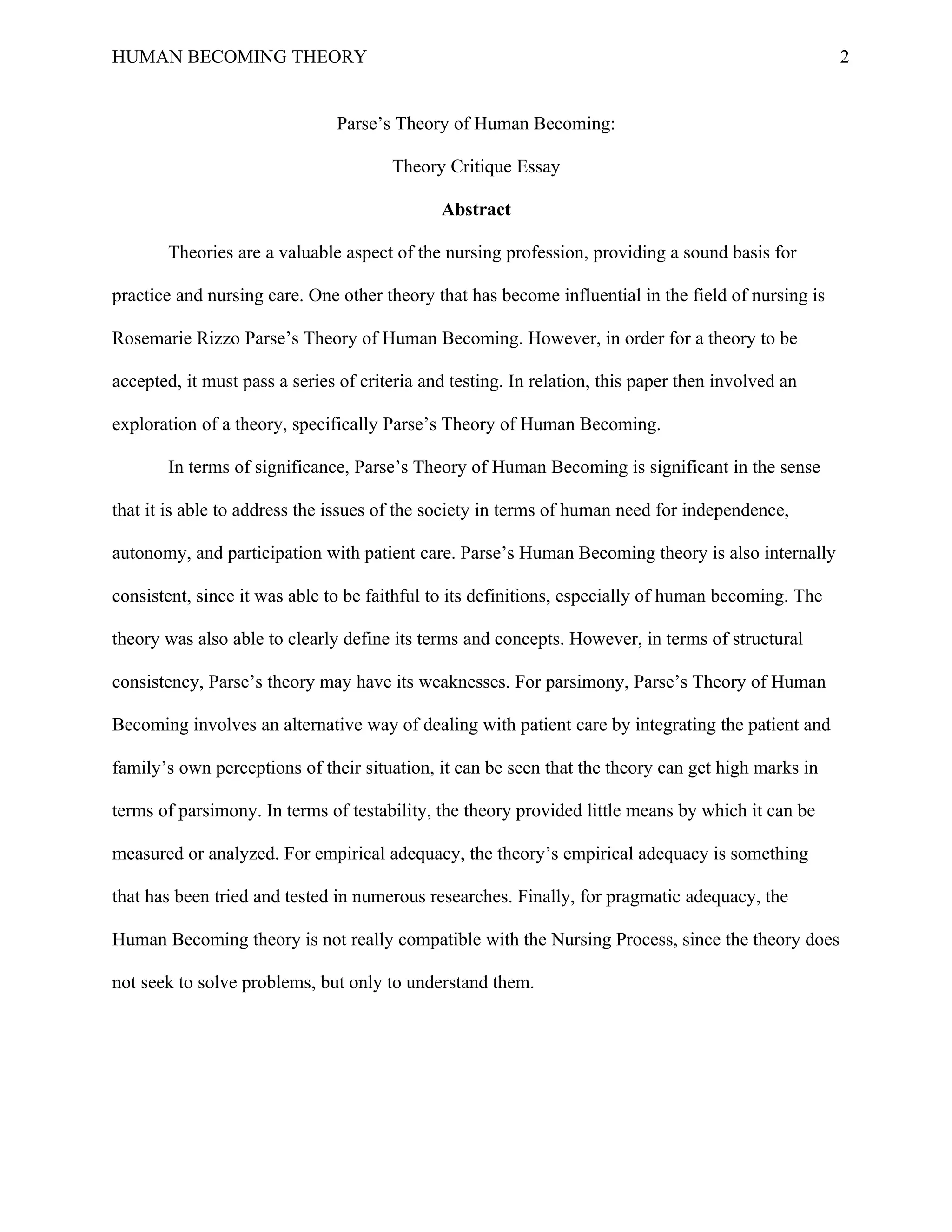 This document provides a critique of Rosemarie Rizzo Parse's Theory of Human Becoming. It begins with an abstract summarizing the paper. The main body first provides background on Parse's theory, outlining its 9 main principles and 3 overarching themes. It then analyzes the theory's empiric basis based on 6 criteria: significance, internal consistency, parsimony, testability, empirical adequacy, and pragmatic adequacy. For significance, the theory addresses human needs for autonomy and participation in care. However, its structural consistency and testability need improvement. The theory provides an alternative perspective in nursing but lacks compatibility with the nursing process.