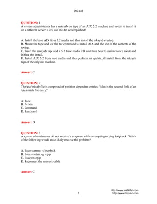 000-232 QUESTION: 1 A systemadministrator has a mksysb on tape of an AIX 5.2 machine and needs to install it on a different server. How can this be accomplished? A. Install the base AIX from 5.2 media and then install the mksysb overtop. B. Mount the tape and use the tar command to install AIX and the rest of the contents of the rootvg. C. Insert the mksysb tape and a 5.2 base media CD and then boot to maintenance mode and initiate the install. D. Install AIX 5.2 from base media and then perform an update_all install from the mksysb tape of the original machine. Answer: C QUESTION: 2 The /etc/inittab file is composed of position-dependent entries. What is the second field of an /etc/inittab file entry? A. Label B. Action C. Command D. RunLevel Answer: D QUESTION: 3 A system administrator did not receive a response while attempting to ping loopback. Which of the following would most likely resolve this problem? A. Issue startsrc -s loopback B. Issue startsrc -g tcpip C. Issue rc.tcpip D. Reconnect the network cable Answer: C http://www.testkiller.com 2 http://www.troytec.com