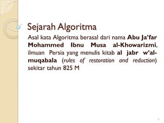 Algoritma merupakan urutan langkah logis untuk menyelesaikan masalah yang harus berakhir dalam jumlah langkah terbatas. Algoritma dirancang untuk menghasilkan output yang tepat guna dalam waktu dan memori yang efisien. Algoritma dapat ditulis dalam bahasa alami, flowchart, atau pseudocode sebelum diimplementasikan dalam program komputer.