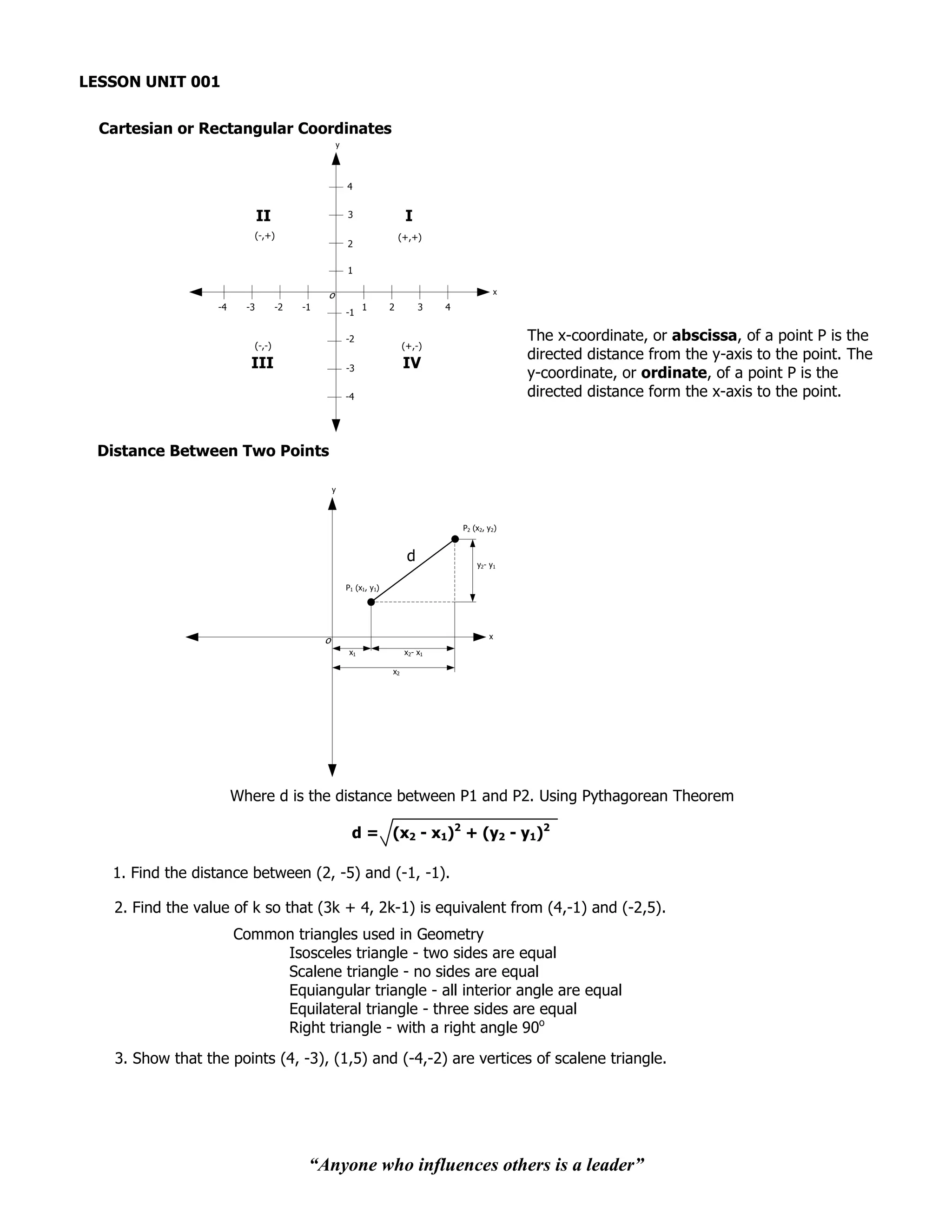 1. The document provides examples and explanations of key concepts in geometry including Cartesian coordinates, distance between points, types of triangles, area of triangles and polygons, division of line segments, slope and inclination of lines, and angle between two lines.