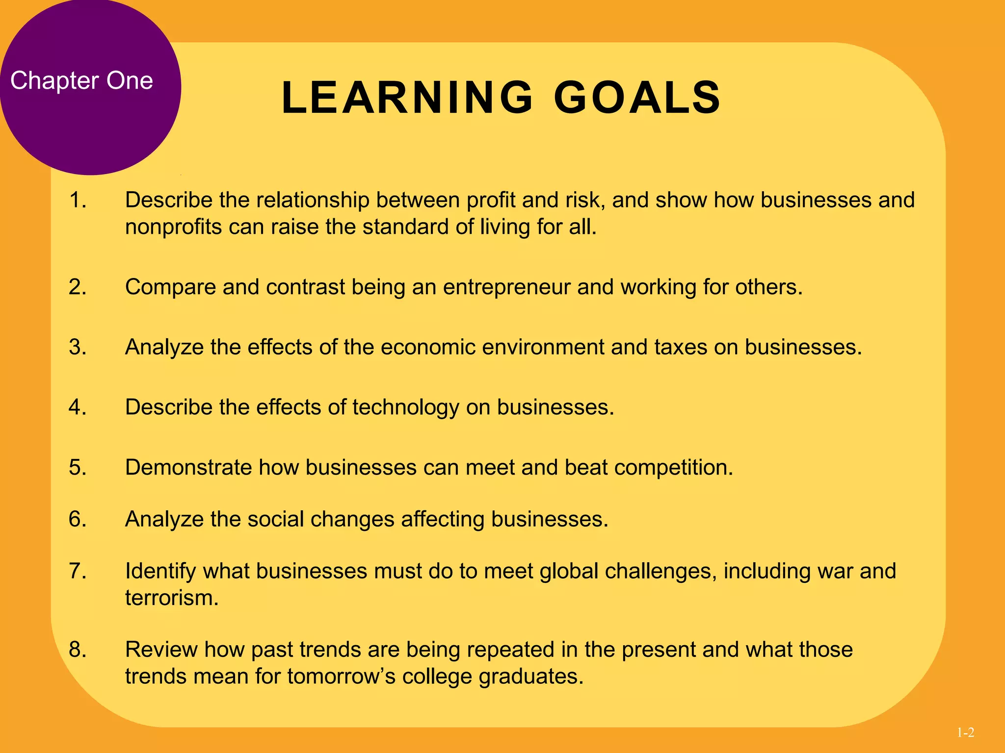 1. It defines key business terms like revenue, profit, loss, risk, and stakeholders. It explains how businesses add to standards of living.