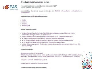 Abikõlblikud kulud Projektielluviimisega seotud personalikulud Sisseostetud teenused (ekspertiis, uuringud jne) Õppereisidel ja muudel projektiga seotud üritustel osalemise kulud Immateriaalse vara soetamisega seotud kulud (tarkvara) MTÜ loomisega seotud kulud (notaritasud, riigilõivud jne) 12/10/09