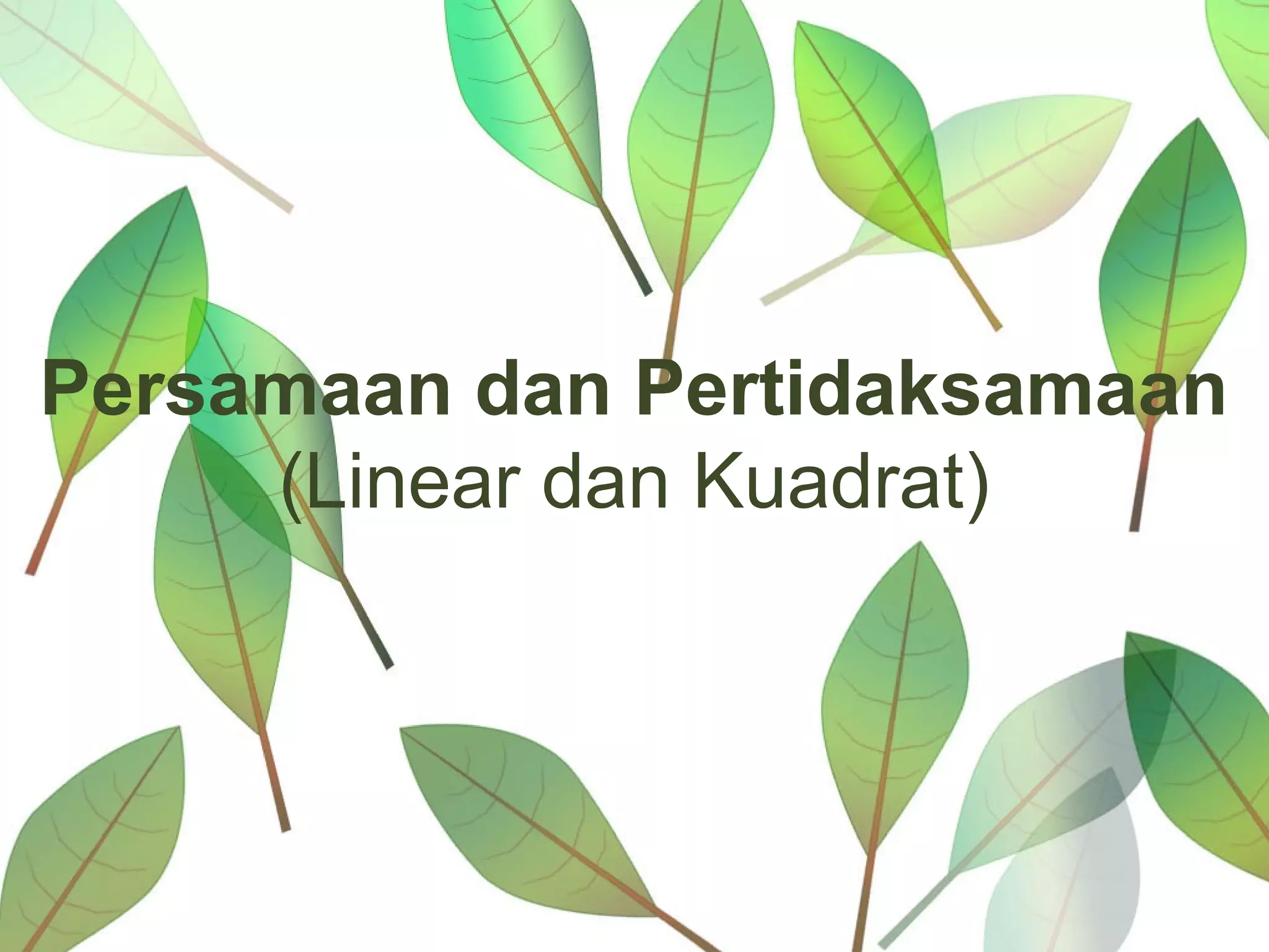 Dokumen membahas tentang persamaan dan pertidaksamaan linear dan kuadrat, termasuk definisi, bentuk umum, serta metode penyelesaian. Persamaan linear satu variabel memiliki bentuk ax + b = 0, sedangkan persamaan kuadrat memiliki pangkat tertinggi dua. Selain itu, dibahas juga sifat-sifat dan langkah-langkah penyelesaian untuk pertidaksamaan linear dan kuadrat.