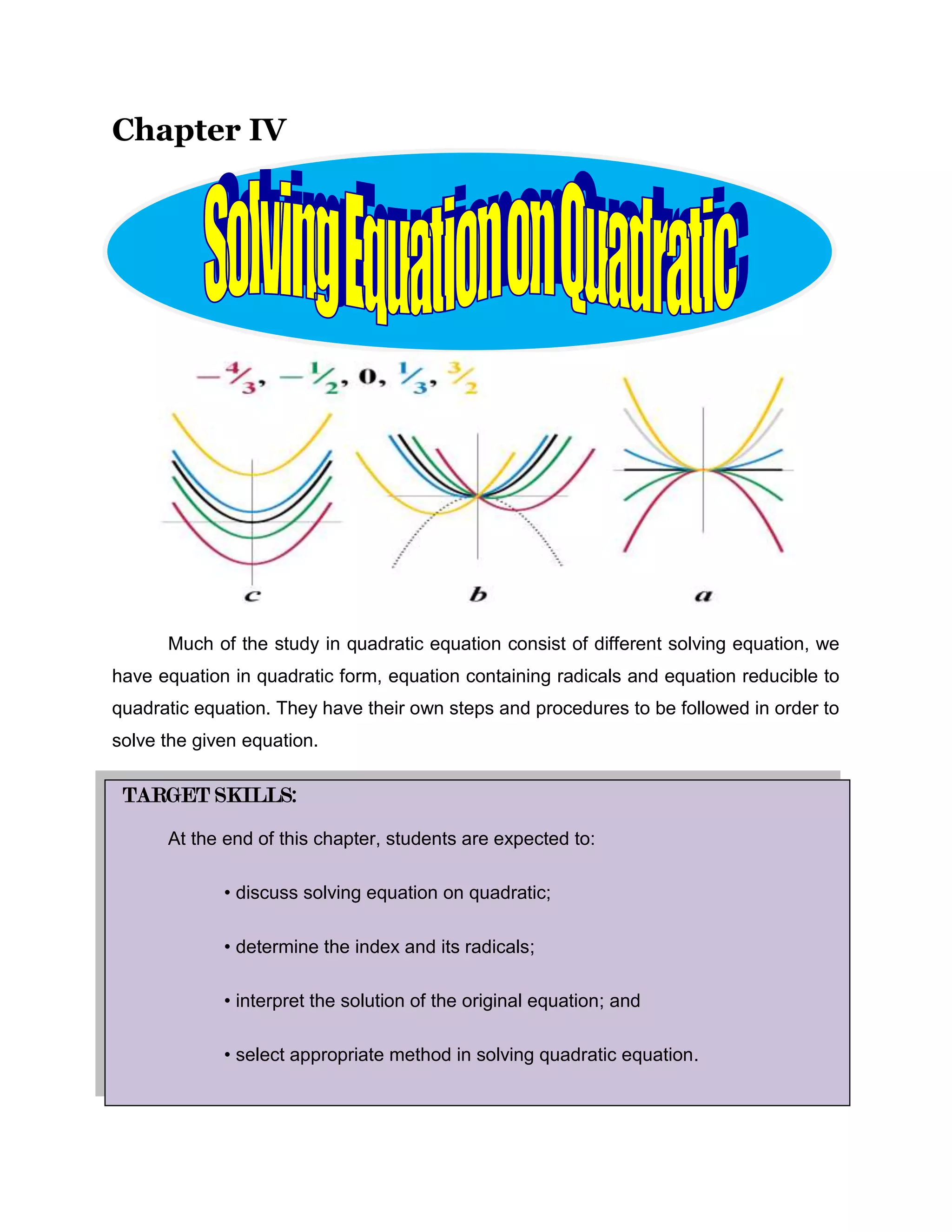 This document provides instruction on solving various types of equations, including quadratic equations, equations containing radicals, and equations that can be reduced to quadratic form. It includes examples of solving equations that are quadratic in form by rewriting them in standard form and substituting a variable, then solving the resulting quadratic equation. It also provides examples of solving equations containing radicals by isolating radicals and raising both sides of the equation to appropriate powers. Students are expected to learn to identify different equation types, select appropriate solution methods, and solve various quadratic and radical equations.