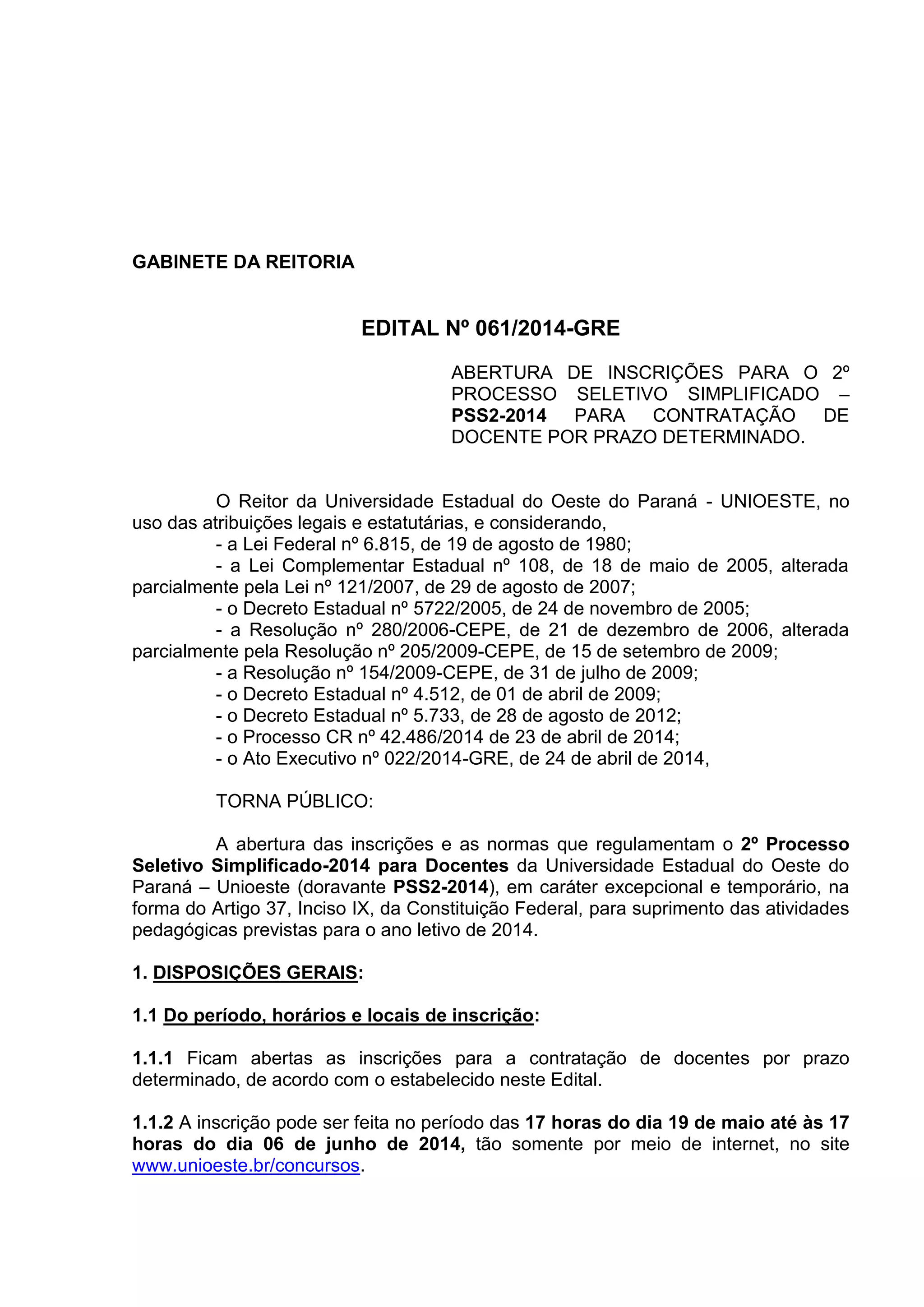 O documento anuncia a abertura de inscrições para o 2o Processo Seletivo Simplificado da Universidade Estadual do Oeste do Paraná para contratação temporária de docentes. Estabelece as normas e prazos para inscrição, taxa de inscrição, documentação requerida, número de vagas por área/matéria, reserva de vagas para pessoas com deficiência e afrodescendentes.