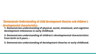 Erikson's psychosocial development theory describes growth through 8 stages focusing on social interactions and conflicts. Behavioral theories view development as shaped by environmental influences and learning through reinforcement. The 4 main domains of child development are communication, physical, social/emotional, and cognitive, and development progresses through milestones and characteristics in each stage.