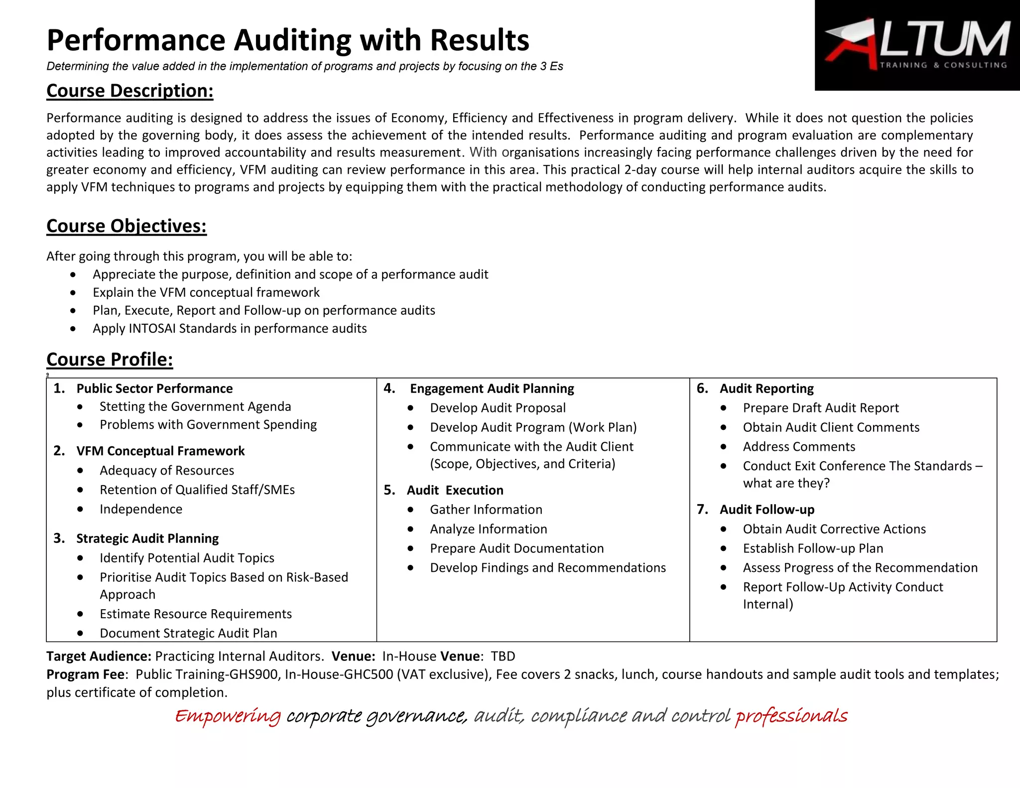 This 2-day course teaches performance auditing techniques to help internal auditors assess the economy, efficiency, and effectiveness of programs and projects. It covers planning, executing, reporting on, and following up on performance audits based on the INTOSAI standards. The objectives are to understand performance auditing concepts, apply a value-for-money framework, and gain the skills to conduct performance audits that evaluate the achievement of intended results and identify opportunities for improved accountability. The course content includes setting performance goals, strategic and engagement audit planning, information gathering and analysis, developing findings and recommendations, and reporting and follow up procedures.