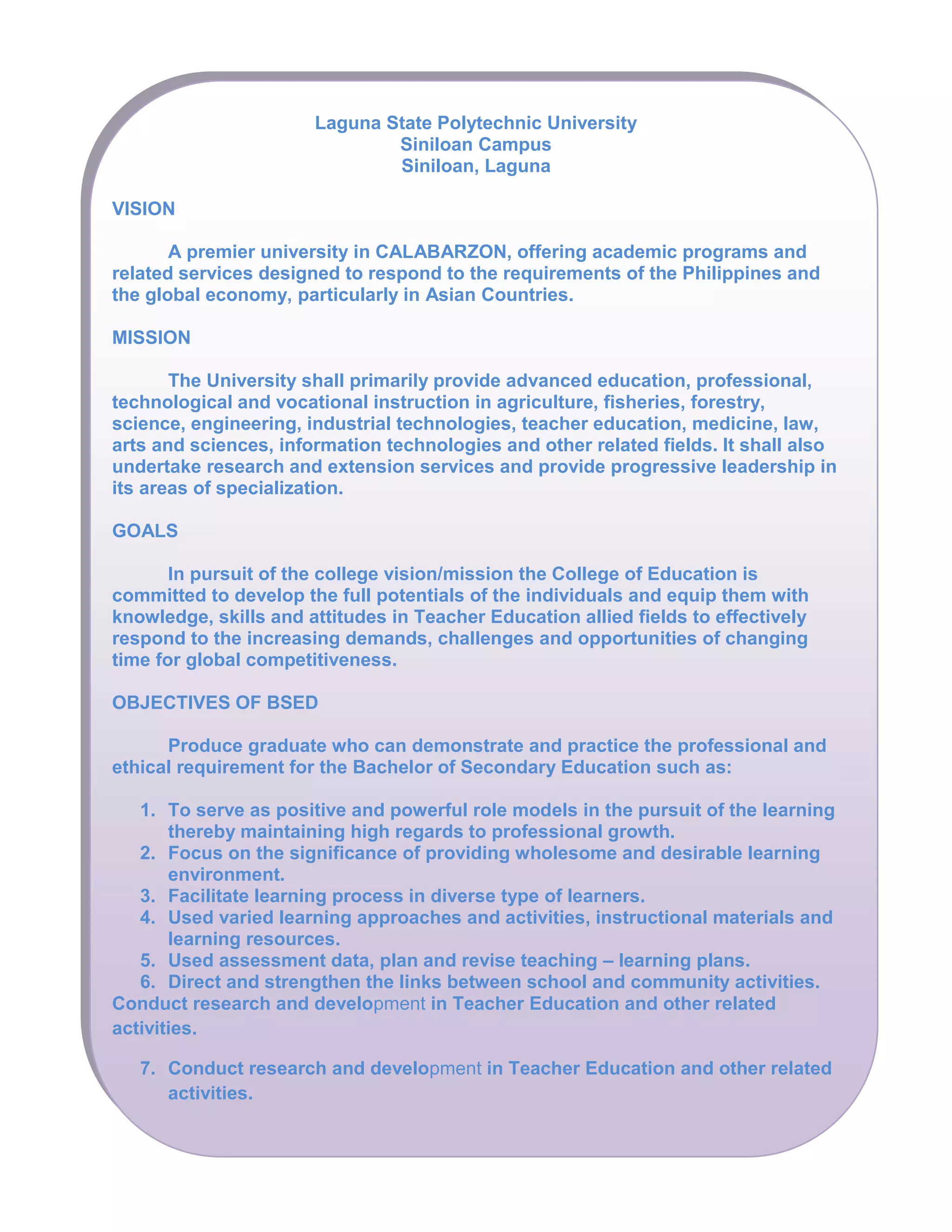 Laguna State Polytechnic University aims to be a premier university in the CALABARZON region of the Philippines offering academic programs that respond to the needs of the Philippines and global economies, particularly in Asian countries. The university provides advanced education in fields like agriculture, science, engineering, teacher education, and more. It also undertakes research and community outreach. The College of Education is committed to developing students' full potential and equipping them with the knowledge, skills, and attitudes needed to be effective teachers and respond to changing times. The Bachelor of Secondary Education program aims to produce graduates who can serve as role models, provide a good learning environment, facilitate learning for diverse students, use various teaching approaches and materials, and