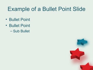 This document provides examples of different slide templates from the Happy Stars template, including bullet point slides, charts, and picture slides. It demonstrates default text styles and features like text boxes. The document explains that you are free to use these templates for personal and business presentations but should not redistribute or sell the templates. It asks to not rehost the templates online for download and to provide a link back if you appreciate the templates.