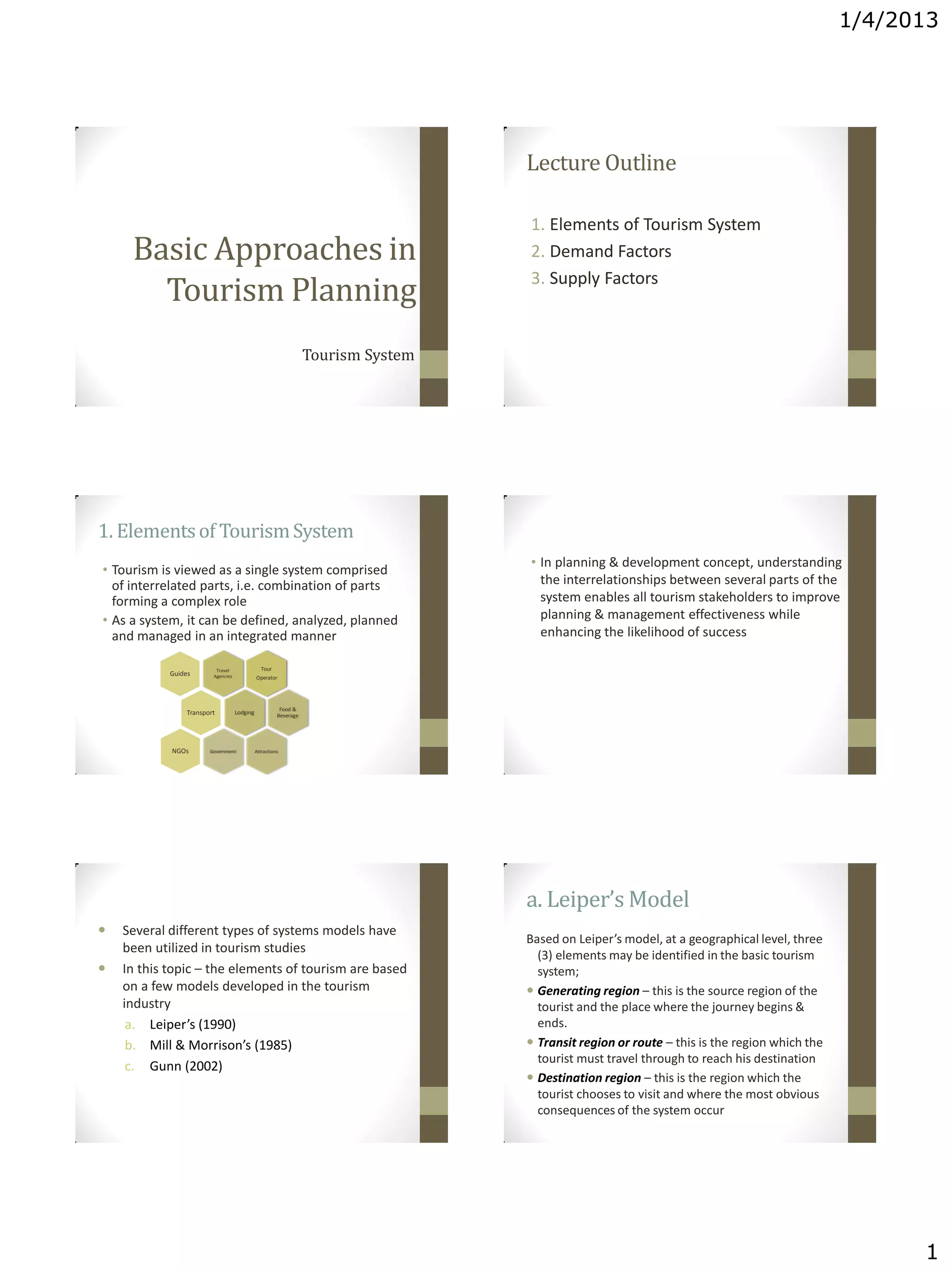 This document outlines the key elements of a tourism system based on three models: Leiper's model identifies three elements - the generating region, transit region, and destination region. Mill and Morrison's model focuses on the market, travel, destination, and marketing. Gunn's model emphasizes the supply and demand dimensions, identifying tourists as the demand side and facilities, attractions, and land uses as the supply side. It also discusses five basic travel motivations (physiological, cultural, social, spiritual, fantasy) and the three main supply side components: resources, government, and the tourism industry.