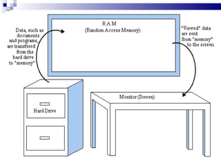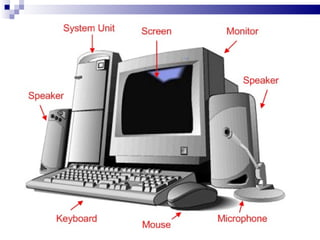 This document discusses fundamentals of computer information systems. It defines key terms like data, information, and data processing. It describes the basic components and functions of an information processing system including input, processing, storage, and output of data. The three major components of a computer system are hardware, software, and peopleware. It also discusses the basic units of computer hardware like the CPU, memory, input/output devices, and storage devices. It provides an overview of operating systems, applications software, files, and directories.