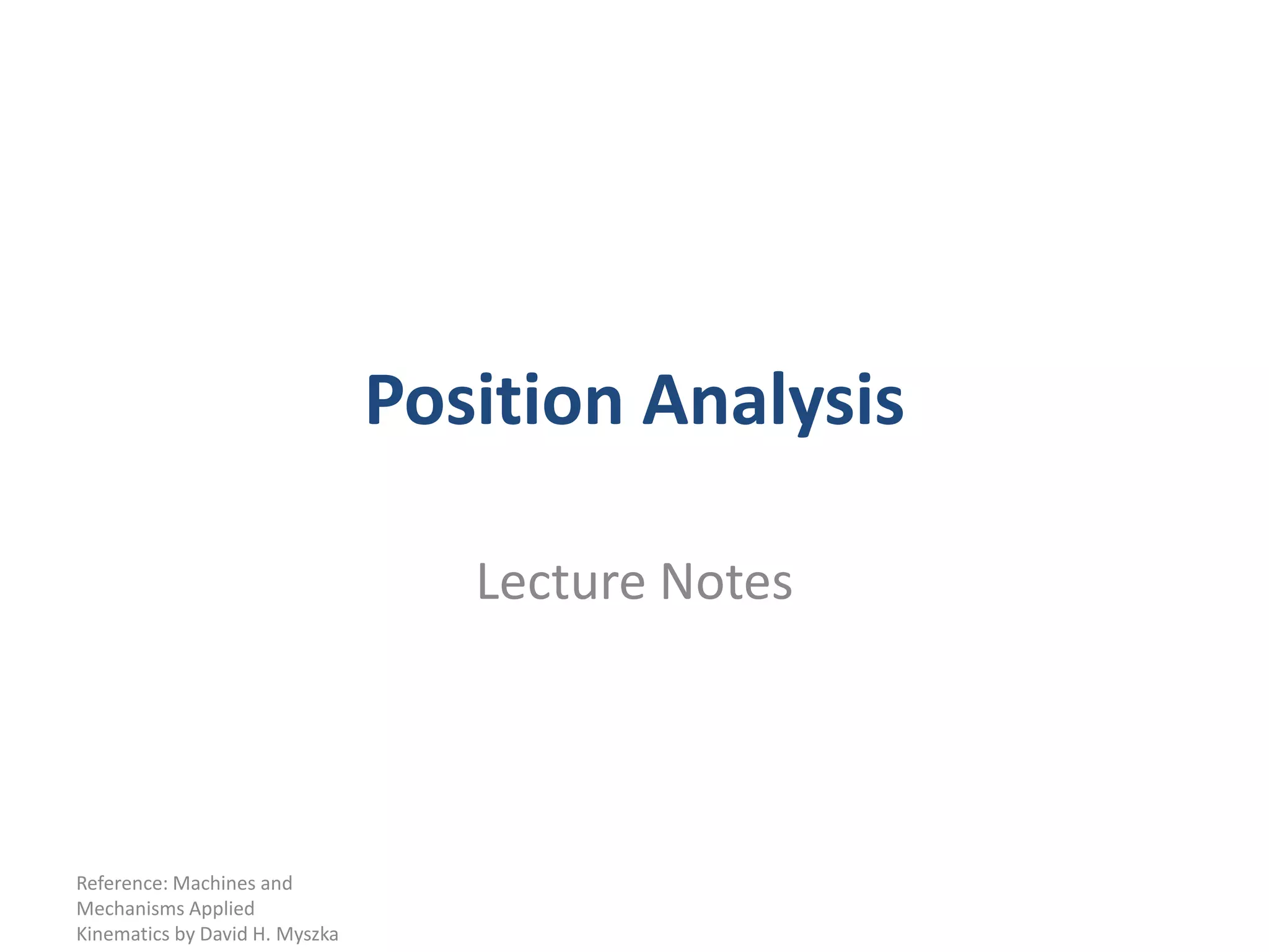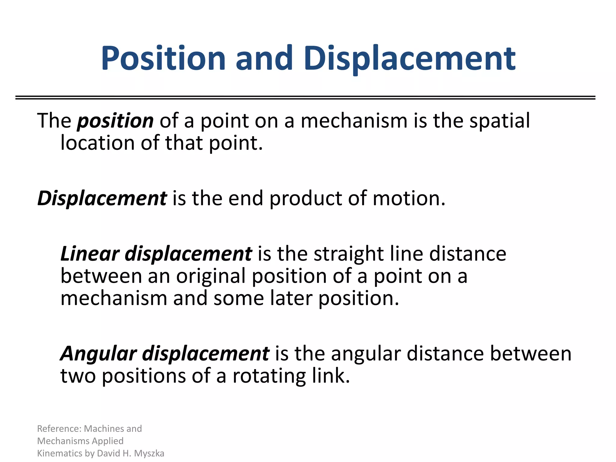 The document discusses position and displacement analysis of mechanisms using graphical and analytical methods. It provides examples of using these methods to determine the displacement of points on mechanisms when links rotate or move. Graphical analysis uses CAD software to visualize the mechanism's motion and calculate displacements, while analytical analysis uses mathematical relationships to solve for displacements.