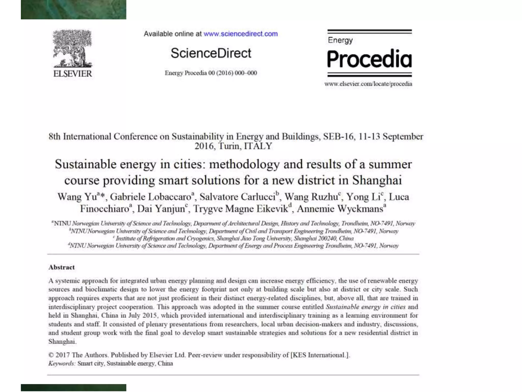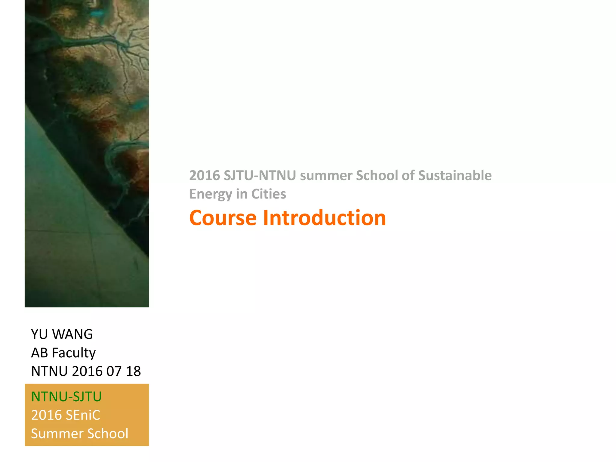 The document provides information about the 2016 SJTU-NTNU Summer School of Sustainable Energy in Cities. The summer school was an interdisciplinary course that brought together 60 students from NTNU, SJTU, and other Chinese universities to focus on developing sustainable energy solutions for cities. Students worked in teams on a project to design a scientific research facility for Jiuduansha Wetland using bioclimatic and renewable energy strategies. They were expected to present preliminary designs after the first week and final designs addressing energy performance, environmental impact, and social/cultural perspectives. The goal was to train students in interdisciplinary collaboration to plan and design urban energy systems more sustainably.