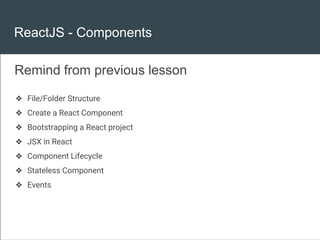 This document provides an overview of working with React components, including file structure, creating components, JSX, lifecycles, stateless components, events, passing props, default props, context, refs, and types of components. It also covers prop type checking and gives examples of smart and reusable components.