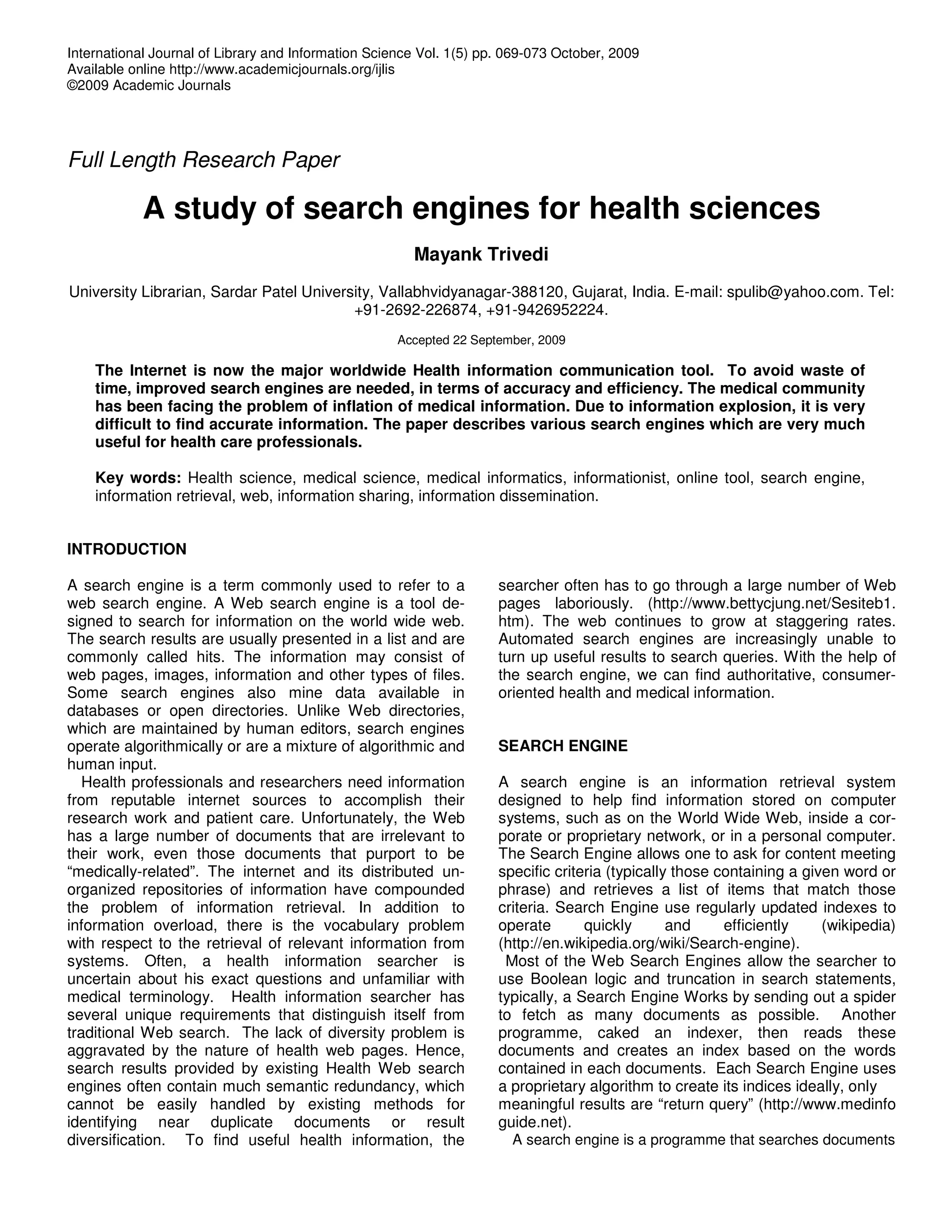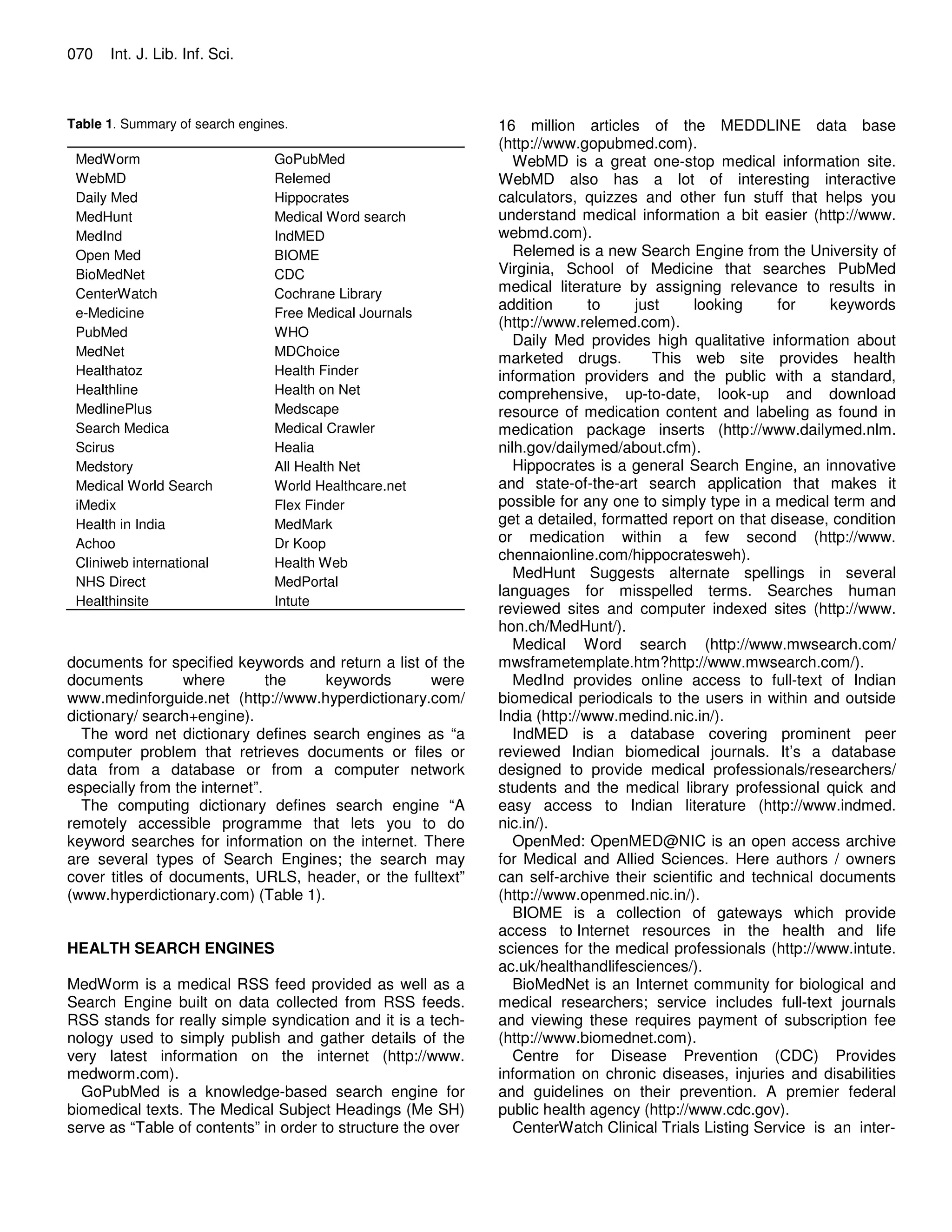 This document discusses various search engines that are useful for health care professionals. It begins by defining search engines and their purpose. It then describes several specialized health search engines, including MedWorm, GoPubMed, and WebMD. It also discusses meta-search engines, which simultaneously search multiple search engines and databases. Finally, it mentions some specialty search engines focused on specific medical fields like cardiology, pharmacology, and dermatology.