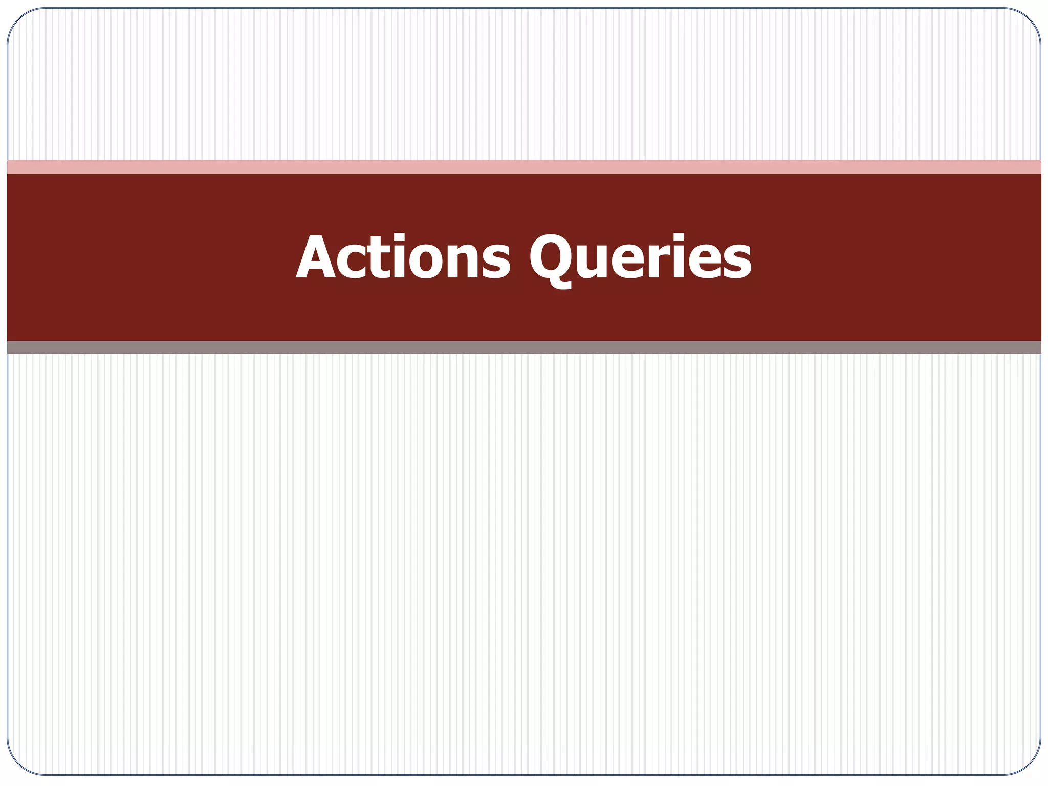 1. Action queries can update, append, make new tables, or delete records in a database.