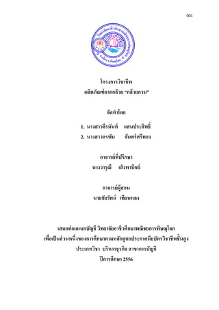 นางสาวจีรนันท์ แสนประสิทธิ เลขประจําตัว 43348 ชัน ปวส. 551/3 2. นางสาวอรพัน จันทร์ศรีทอง เลขประจําตัว 46412 ชัน ปวส. 551/3 อาจารย์ผู้สอนโครงการ นายชัยรัตน์ เทียนหลง อาจารย์ทีปรึกษาโครงการ นางวารุณี เส็งพานิชย์ หลักการและเหตุผล กล้วยเป็นผลไม้เขตเมืองร้อน คนไทยรู้จักและคุ้นเคยมาแต่โบราณคนไทยทุกคนรู้จักกล้วย เป็นอย่างดี กล้วยเป็นพืชเศรษฐกิจทีมีการคัดเลือกพันธุ์ปรับปรุงพันธุ์ ดูแลรักษาเพือให้ได้ผลผลิตที สอดคล้องกับการนํามาใช้ประโยชน์แปรรูปอาหาร คาว หวาน ขนมคบเคียว อาหารว่างเช่น กล้วย ตาก กล้วยฉาบ กล้วยทอด กล้วยอบเนย กล้วยบวชชี เป็นต้น กล้วยเป็นพืชทีอุดมสมบรูณ์ไปด้วย คาร์โปรไฮเดรท แคลเซียม ฟอสฟอรัส วิตามินเอ และมีการพัฒนาการผลิตกล้วยเชิงอุตสาหกรรม แปรรูปกล้วยมากขึน เช่น แป้ งจากกล้วยไวน์จากกล้วยเครืองใช้สอยต่างๆอีกมากมาย จากทีกล่าวมานันกลุ่มข้าพเจ้าจึงมีแนวความคิดทีจะนํากล้วยมาแปรรูปเป็น ผลิตภัณฑ์กล้วย กวนกล้วยกวนสามารถใช้เป็นของฝากได้และเก็บรักษาไว้ได้นานเพือกลุ่มของข้าพเจ้าจะได้นความรู้ ในการทํา ”กล้วยกวน” มาเป็นแนวทางในการประกอบอาชีพส่งเสริมรายได้ในระหว่างเรียนและใน อนาคตต่อไป วัตถุประสงค์ของโครงการ 1. เพือให้ผู้เรียนมีความรู้ ความเข้าใจ และขันตอนการแปรรูปเป็นผลิตภัณฑ์กล้วยกวน 2. เพือฝึกการสร้างความคิดริเริมสร้างสรรค์การทํากล้วยกวน 3. เพือก่อให้เกิดรายได้และนําไปสู่แนวทางในการประกอบอาชีพในอนาคต