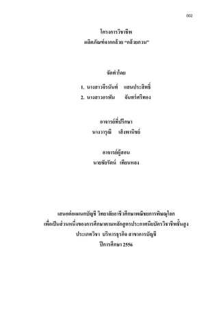 กรกฎาคม 2556. จาก http://www.dailynews.co.th/article/384/3555 ปรพพาสิท โกศินานนท์. (2546).หลักการตลาด. กรุงเทพ ฯ : เอมพันธ์ ป้ าบุญรวม เปรมปริก. (2555) วิธีทําขนมกล้วยกวน ค้นหาข้อมูล 1 กรกฎาคม 2556. จาก http://board.postjung.com/537178.html วรรณา วงศ์วิวัฒน์. (2555) การบัญชีต้นทุน 2. นนทบุรี : เอมพันธ์ วินิดา วีระเกียรติ. (2546) การบัญชีต้นทุน 1. กรุงเทพ ฯ : เอมพันธ์ สมยส เหมวัสดุกิจ. (2555) การวางแผนและควบคุมงบโดยประมาณ. กรุงเทพ ฯ: วังอังกฤษ