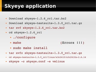 This document provides instructions for setting up and running a Linux system simulation using the Skyeye simulator for ARM architectures. The steps include: 1) Installing Skyeye and a cross-compiler toolchain; 2) Compiling a Linux kernel and filesystem utilities; 3) Creating a root filesystem image; 4) Configuring and running Skyeye with the kernel and filesystem image. This allows testing a complete Linux system without requiring dedicated ARM hardware.