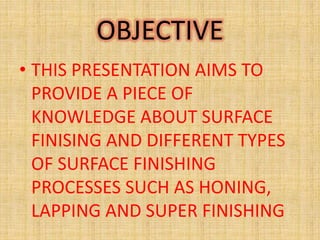 This presentation discusses various surface finishing processes. It provides details on honing, lapping, and super finishing. Honing uses an abrasive stone to improve the geometric form and surface texture of metal workpieces. Lapping rubs two surfaces together with an abrasive to achieve high precision and smooth finishes. Super finishing removes undesirable metal fragments to leave a smooth crystalline base. Each process is used to produce precise surfaces and dimensions for parts.