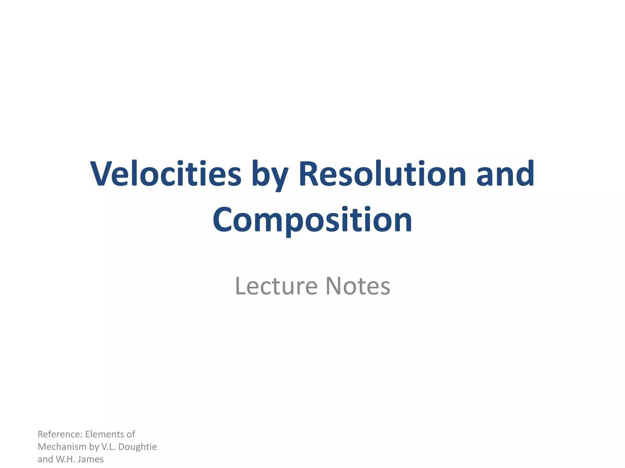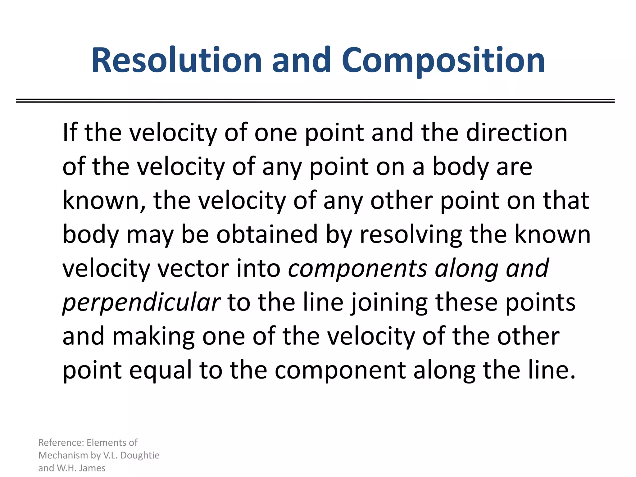 The document discusses resolving velocities into components and calculating velocities at different points on a body. It provides two examples of using graphical analysis to calculate velocities at points on linkages, where the angular velocity of a crank is given. The examples demonstrate resolving velocities into components along and perpendicular to lines connecting points to determine individual point velocities.