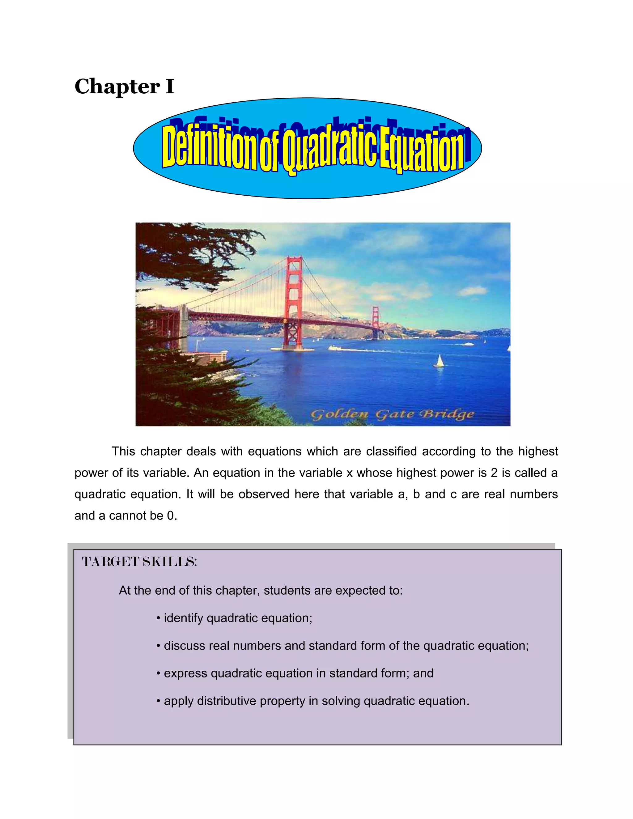 This chapter discusses quadratic equations, which are equations with the highest power of the variable being 2. A quadratic equation can be written in the standard form ax^2 + bx + c = 0, where a, b, and c are real numbers and a is not equal to 0. The lesson provides examples of writing equations in standard form and identifying which equations are quadratic. Students are expected to be able to identify quadratic equations, write them in standard form, and apply the distributive property when solving them.