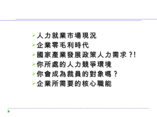 專業技能的迷思 「就業力」不等於專業技能或學歷 3QVery Much : IQ + EQ + AQ 職能冰山理論:職能= K ( Knowledge 知識)+ A ( Attitude 態度)+ S ( Skill 技能),知識與技能只是表面看得到的競爭力 C = ( K + S ) A 迷思:年輕人自認為最需要強化「 專業技能 」,其實企業認為是「 工作態度 」