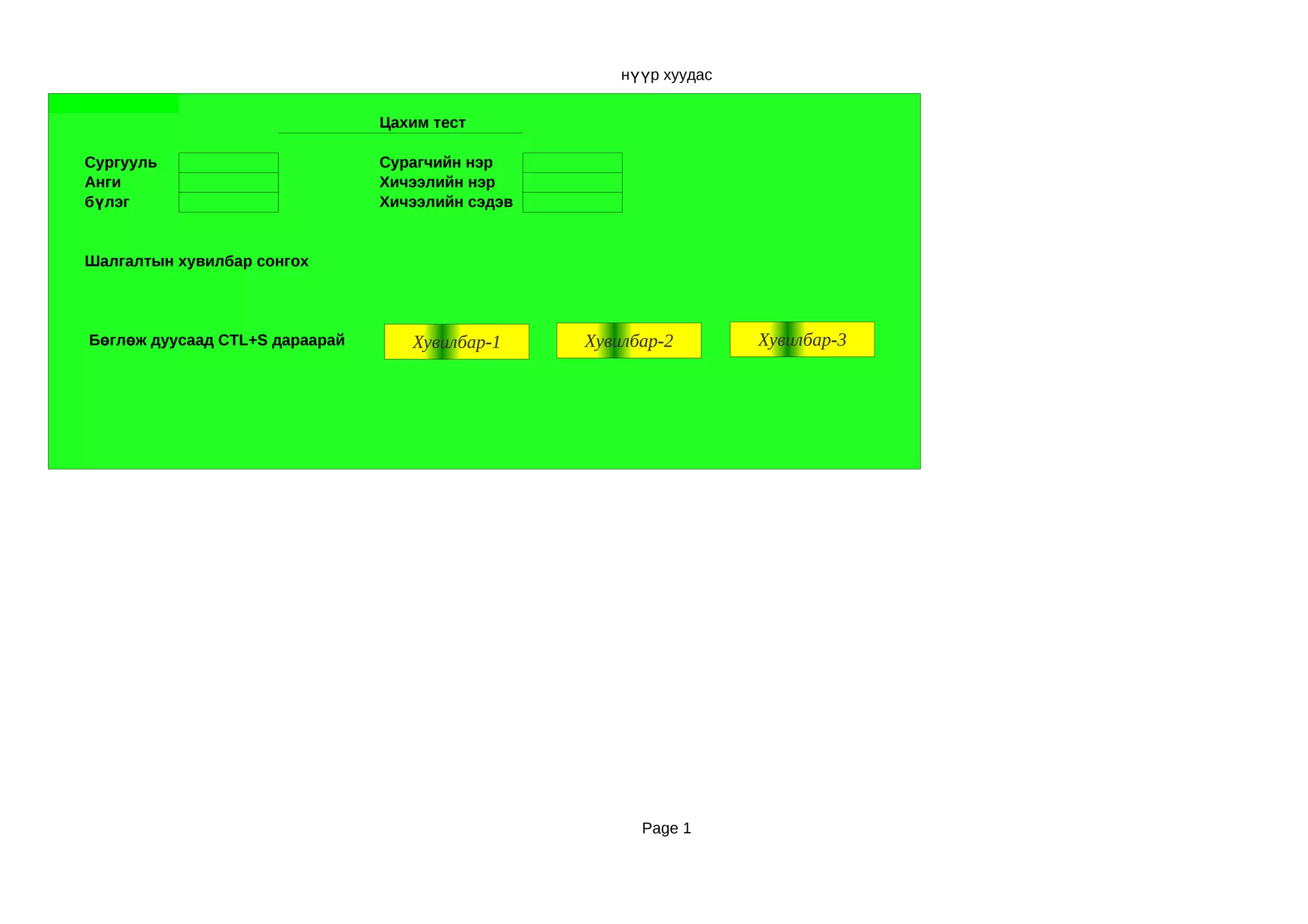 Цахим тест Сургууль Сурагчийн нэр Анги Хичээлийн нэр бүлэг Хичээлийн сэдэв Шалгалтын хувилбар сонгох Бөглөж дуусаад CTL+S дараарай Хувилбар-1 Хувилбар-2 Хувилбар-3 Page 1