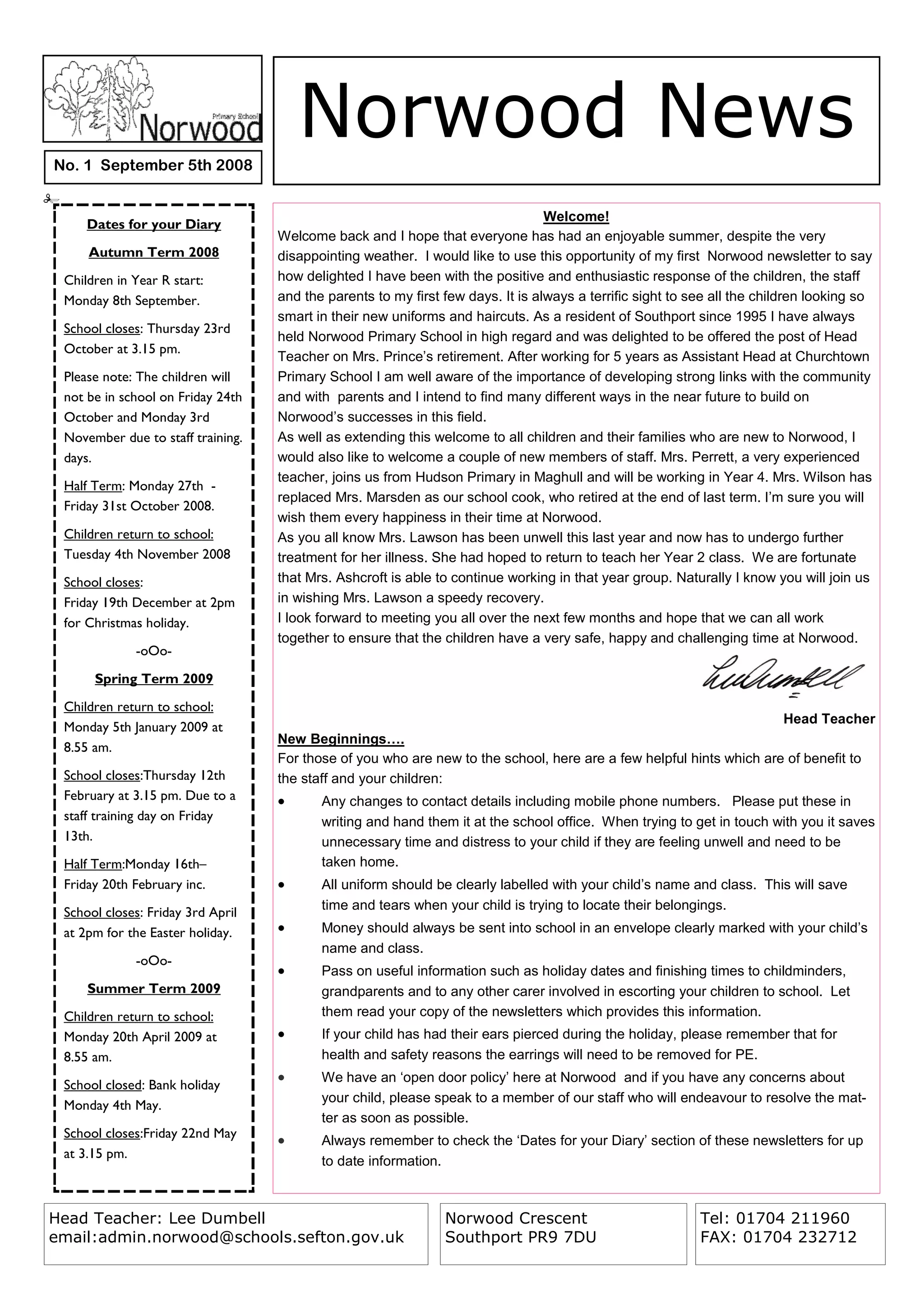 The document provides information about the start of the new school year at Norwood Primary School. It introduces the new head teacher, Lee Dumbell, and welcomes parents and children back for the autumn term. It also provides notices about upcoming dates, staffing changes, school policies and events at the school.