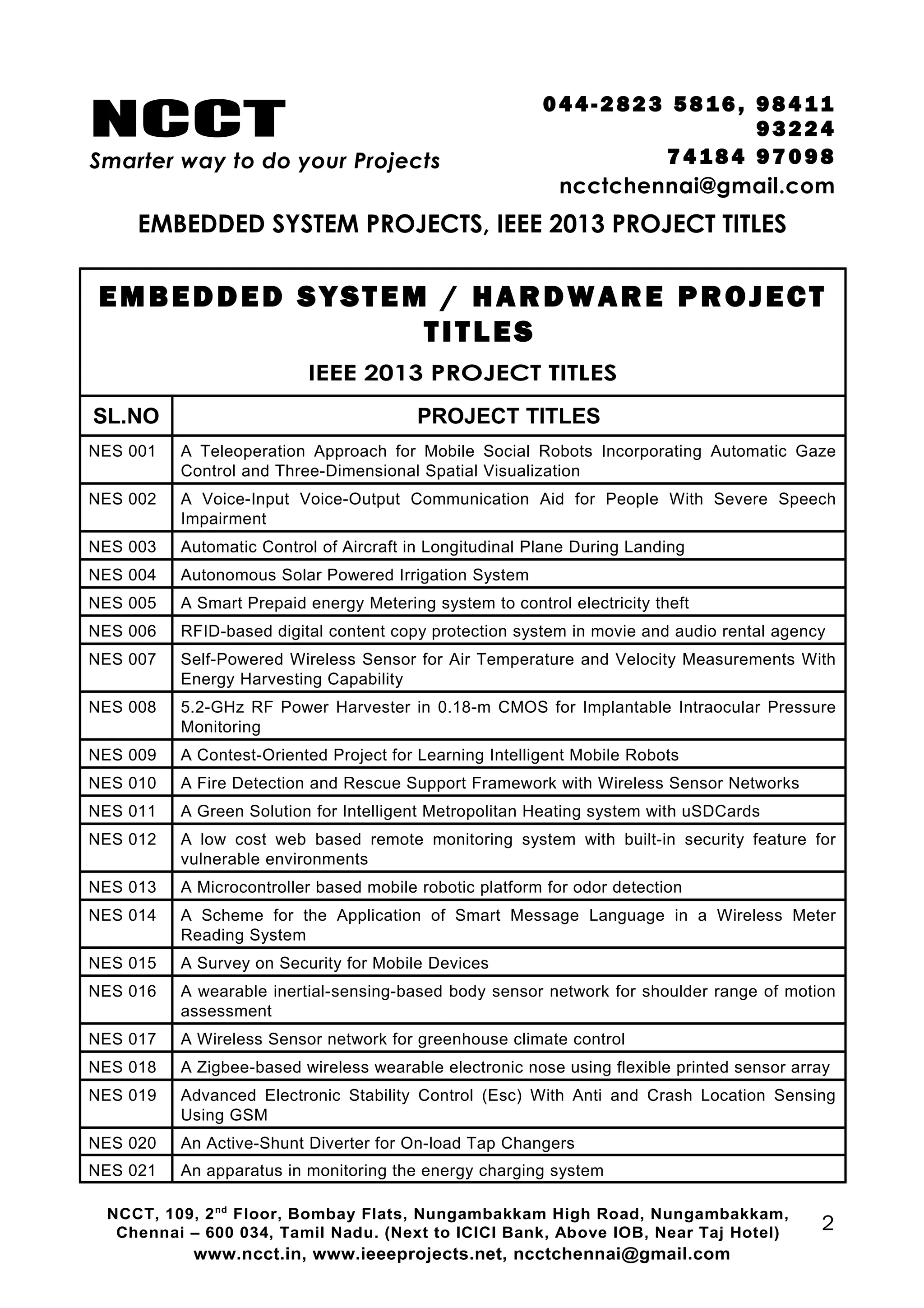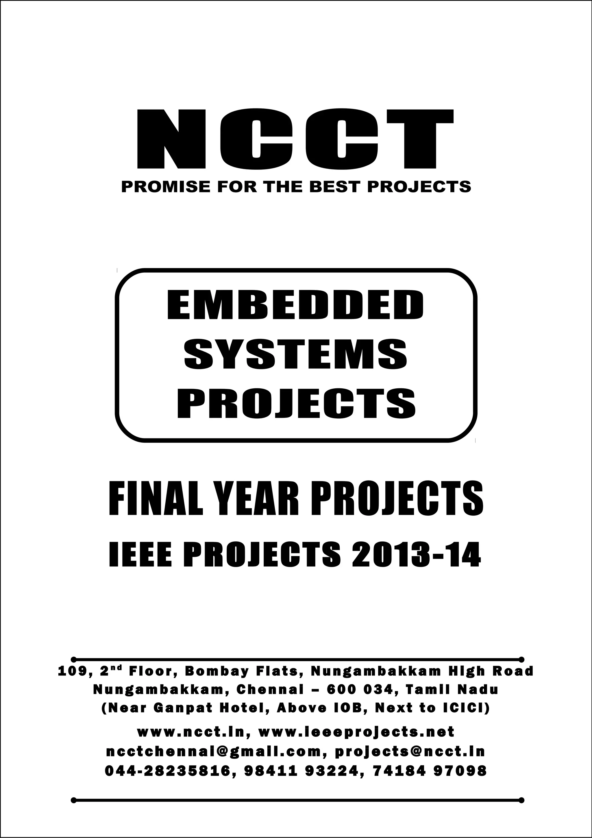 The document provides an extensive list of embedded system project titles from the National College of Technology (NCCT) for 2013-14, highlighting innovative ideas such as smart irrigation systems, wireless sensor networks, and health monitoring technologies. It emphasizes that NCCT offers over 500 IEEE project titles in various domains and assures guidance and support for final year projects. The contact information and location details for NCCT in Chennai are also included.