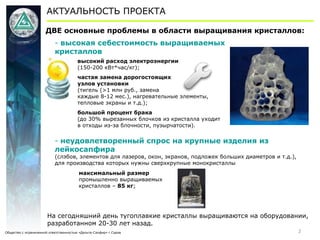 Документ описывает проект компании «Дельта-Сапфир» по разработке энергоэффективной установки для выращивания крупных монокристаллов сапфира методом, который решит проблемы высокой себестоимости и брака. Предложенная установка «М500» позволит увеличить размер кристаллов и сократить затраты на электроэнергию, что улучшит конкурентоспособность продукции на международном рынке. Ожидается, что проект привлечет финансирование и будет способствовать развитию новых применений лейкосапфира в микроэлектронике и других высокотехнологичных отраслях.