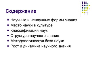 Документ рассматривает место науки в культуре, классификацию научных и ненаучных форм знания, а также методологические основы науки. Приведены взгляды на развитие научного знания, включая концепции позитива и критического рационализма, а также поляризацию между естественнонаучной и гуманитарной культурой. Особое внимание уделяется взаимодействию науки и искусства, а также структурным аспектам научного знания и его динамике.