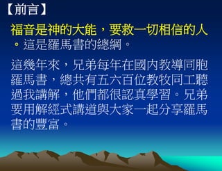 【前言】 福音是神的大能,要救一切相信的人 。這是羅馬書的總綱。 這幾年來,兄弟每年在國内教導同胞 羅馬書,總共有五六百位教牧同工聽 過我講解,他們都很認真學習。兄弟 要用解經式講道與大家一起分享羅馬 書的豐富。