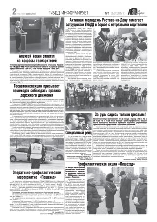 ã. 5http://www.gibdd.ru/r/61 Òûñÿ÷è øêîëüíèêîâ ïðèíÿëè ó÷àñòèå â ñåìåéíûõ çàíÿòèÿõ ïî ïðàâèëàì äîðîæíîãî äâèæåíèÿ Ïðîôìåðîïðèÿòèå «Çâîíîê áåçîïàñíîñòè» Â öåëÿõ ïðåäóïðåæäåíèÿ äîðîæíî-òðàíñïîðòíûõ ïðîèñøåñòâèé, ñ ó÷àñòèåì âîäèòåëåé, óïðàâëÿþ- ùèõ òðàíñïîðòíûìè ñðåäñòâàìè â ñîñòîÿíèè àë- êîãîëüíîãî èëè íàðêîòè÷åñêîãî îïüÿíåíèÿ, íà òåð- ðèòîðèè Ðîñòîâñêîé îáëàñòè, 20 ÿíâàðÿ 2017 ãîäà ïðîâåäåíî ïðîôèëàêòè÷åñêîå ìåðîïðèÿòèå «Çâî- íîê áåçîïàñíîñòè!».  ðàìêàõ ïðîâåäåíèÿ àêöèè ñîòðóäíèêè ÃÈÁÄÄ ïîäãîòî- âèëè ñïåöèàëüíûå íàêëåéêè ñ ïðèçûâîì ê ãðàæäàíàì ñîîá- ùàòü â ïîëèöèþ î ôàêòàõ óïðàâëåíèÿ òðàíñïîðòíûìè ñðåä- ñòâàìè âîäèòåëÿìè, íàõîäÿùèìèñÿ â ñîñòîÿíèè îïüÿíåíèÿ. Ìåðîïðèÿòèå ïðîâîäèëîñü íà 1084 êì àâòîäîðîãè Ì-4 «Äîí». Íà 50 òðàíñïîðòíûõ ñðåäñòâàõ áûëè ðàñêëååíû íà- êëåéêè ñ íàäïèñüþ «Óâèäåë ïüÿíîãî âîäèòåëÿ, çâîíè 102, ñïàñè åìó è äðóãèì æèçíü». Ñòîèò îòìåòèòü îòâåòñòâåííîñòü êàæäîãî èç îñòàíîâëåííûõ ó÷àñòíèêîâ äîðîæíîãî äâèæå- íèÿ. Íèêòî èç âîäèòåëåé íå îòêàçàë â ðàçìåùåíèè ïàìÿòêè íà ñâîåì àâòîìîáèëå, à íàîáîðîò ïîääåðæàëè öåëü ïðîâî- äèìîé àêöèè è ïðîñèëè äîïîëíèòåëüíî âçÿòü ñ ñîáîé àãèòà- öèîííûé ìàòåðèàë. Çà òåêóùèé ïåðèîä 2017 ãîäà, ñîòðóäíèêàìè ÃÈÁÄÄ çà óïðàâëåíèå òðàíñïîðòíûìè ñðåäñòâàìè â ñîñòîÿíèè îïüÿ- íåíèÿ è îòêàç îò ïðîõîæäåíèÿ îñâèäåòåëüñòâîâàíèÿ íà ñî- ñòîÿíèå îïüÿíåíèÿ âñåãî ñîñòàâëåíî 727 àäìèíèñòðàòèâ- íûõ ìàòåðèàëîâ. Ãîñàâòîèíñïåêöèÿ Ðîñòîâñêîé îáëàñòè ïðåäóïðåæäàåò, ÷òî óïðàâëåíèå òðàíñïîðòíûì ñðåäñòâîì â ñîñòîÿíèè àëêî- ãîëüíîãî èëè íàðêîòè÷åñêîãî îïüÿíåíèÿ ÿâëÿåòñÿ îäíèì èç ñàìûõ ãðóáûõ âèäîâ ïðàâîíàðóøåíèÿ, çà êîòîðîå ïðåäó- ñìîòðåíî àäìèíèñòðàòèâíîå íàêàçàíèå â âèäå øòðàôà â ðàçìåðå 30 òûñÿ÷ ðóáëåé, è ëèøåíèå ïðàâà óïðàâëåíèÿ òðàíñïîðòíûì ñðåäñòâîì íà ñðîê îò 1,5 äî 2 ëåò. Äîðîæíûåïðàâèëàñîáëþäàåøü–«Ñïàñèáî»ïîëó÷àåøü! 12 ÿíâàðÿ â Ðîñòîâå-íà-Äîíó èí- ñïåêòîðû ÄÏÑ ïðîâåëè àêöèþ «Äîðîæíûå ïðàâèëà ñîáëþäà- åøü – «Ñïàñèáî» ïîëó÷àåøü!» Ýòà àêöèÿ ïðîâîäèòñÿ ñ öåëüþ ñíè- æåíèÿ êîëè÷åñòâà ÄÒÏ, ïðîïàãàíäû êóëüòóðíîãî ïîâåäåíèÿ íà äîðîãå. Íà óëèöàõ ãîðîäà ïîëèöåéñêèå âðó÷àëè ïåøåõîäàì, âîäèòåëÿì è ïàññàæèðàì ïëàêàòû è áóêëåòû ïî ÏÄÄ, à òàêæå ëèñòîâêè, óâåäîìëÿþùèå îá îïàñíî- ñòÿõ, ïîäñòåðåãàþùèõ íà äîðîãå. Ñ âîäèòåëÿìè èíñïåêòîðû ÄÏÑ ïðîâîäèëè ðàçúÿñíèòåëüíûå áåñåäû î íåîáõîäèìîñòè íåóêîñíèòåëüíîãî ñî- áëþäåíèÿ ñêîðîñòíîãî ðåæèìà, áåçî- ïàñíîé äèñòàíöèè, ñèãíàëîâ ñâåòîôî- ðîâ, òðåáîâàíèé äîðîæíûõ çíàêîâ è ðàçìåòîê, ïðàâèë ïðåäîñòàâëåíèÿ ïðå- èìóùåñòâà â äâèæåíèè ïåøåõîäàì, ïðîåçäà ïåðåêðåñòêîâ è äâîðîâûõ ïðî- åçäîâ, èñïîëüçîâàíèÿ ðåìíåé áåçîïà- ñíîñòè è ñïåöèàëüíûõ óäåðæèâàþùèõ óñòðîéñòâ ïðè ïåðåâîçêå â àâòîìîáèëå íåñîâåðøåííîëåòíèõ. Ïåøåõîäàì ïî- ëèöåéñêèå ðàçúÿñíÿëè ïðàâèëà è ôóíêöèè ñâåòîîòðàæàþùèõ ýëåìåíòîâ, ñïîñîáíûõ â óñëîâèÿõ ïëîõîé âèäèìî- ñòè ñäåëàòü èõ çàìåòíåå íà äîðîãå. Ðî- äèòåëÿì ðàññêàçûâàëè î íåîáõîäèìî- ñòè ñîáëþäåíèÿ ÏÄÄ, îñîáåííî â ïðè- ñóòñòâèè ðåáåíêà, îáó÷åíèÿ åãî íàâû- êàì áåçîïàñíîãî ïîâåäåíèÿ è âîñïèòà- íèÿ êóëüòóðíîãî ïîâåäåíèÿ. Ó÷àñòíèêàì äîðîæíîãî äâèæåíèÿ, ñîáëþäàþùèì Ïðàâèëà äîðîæíîãî äâèæåíèÿ, ïîëèöåéñêèå ãîâîðèëè «Ñïàñèáî» è âðó÷àëè ñâåòîîòðàæàþùèå íàêëåéêè ñ âåñåëûìè ñìàéëèêàìè. Ïðåäñòàâëåí èííîâàöèîííûé êóá-òðàíñôîðìåð äëÿ èçó÷åíèÿ äîðîæíûõ çíàêîâ äåòüìè Ñîòðóäíèêè è ñòóäåíòû êàôåäðû «Àâòîìîáèëüíûé òðàíñ- ïîðò è îðãàíèçàöèÿ äîðîæíîãî äâèæåíèÿ» Þæíî-Ðîññèé- ñêîãî ãîñóäàðñòâåí