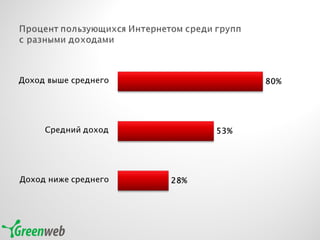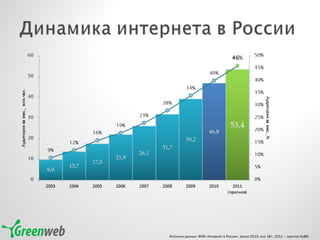 Документ содержит данные о среднедневном охвате медиа в России в 2010 году, включая информацию о телевидении, радио и интернет-ресурсах. Представлены цифры охвата по возрастным группам для городов с населением более 100 тысяч человек, а также популярности различных интернет-сервисов. Основные источники данных включают TNS и ассоциацию коммуникационных агентств России.
