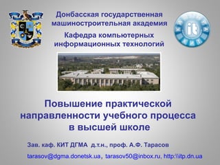 Документ описывает развитие практической направленности учебного процесса в Донбасской Государственной Машиностроительной Академии через сотрудничество с другими вузами, введение новых дисциплин и технологий дистанционного обучения. Основные специализации включают информационные технологии в технике, веб-ориентированных системах и медицине, с акцентом на применение полученных знаний в различных отраслях. Также документ упоминает об итогах аккредитации кафедр, подготовке преподавателей и внедрении новых учебных курсов и лабораторий.