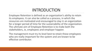 The document presents a study on the employee retention strategy of Bright Brothers Pvt Ltd in Pondicherry. It discusses the company profile, research methodology used, data collection and analysis. The study found that most employees think implementation of 3R's (recognition, rewards, respect) will increase retention. It also found low salary and lack of career growth are main reasons employees leave. The study suggests improving compensation, providing flexible schedules, discussing career anchors, and ensuring right job fits to boost retention.