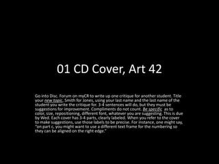 Students are instructed to provide a critique of another student's CD cover design in the Disc Forum on myCR. Critiques should be 3-4 sentences suggesting improvements and should not include compliments. Suggestions should be specific, such as changing color, size, positioning, or font. Critiques are due by Wednesday and should refer to the clearly labeled parts (a, b, c, etc.) of each cover design. For example, suggesting using a different text frame for numbering on part c so they are aligned.