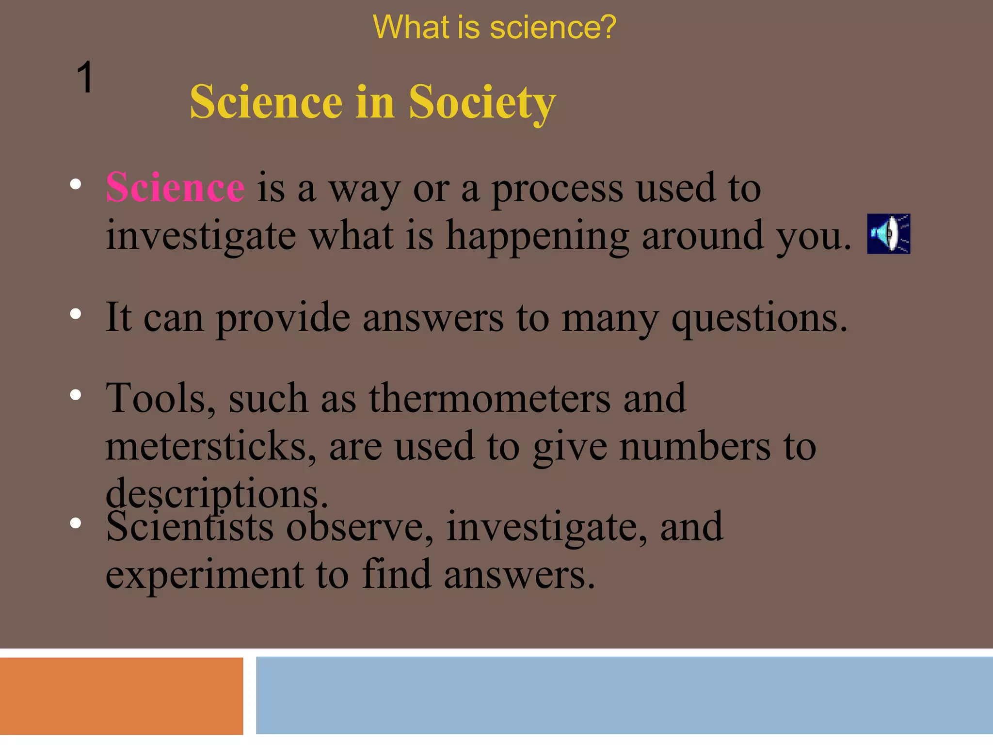 1. The document discusses the process of science and how scientists investigate problems. It describes the steps scientists take to define problems, design research to study problems through observation or experimentation, analyze data, and communicate conclusions.