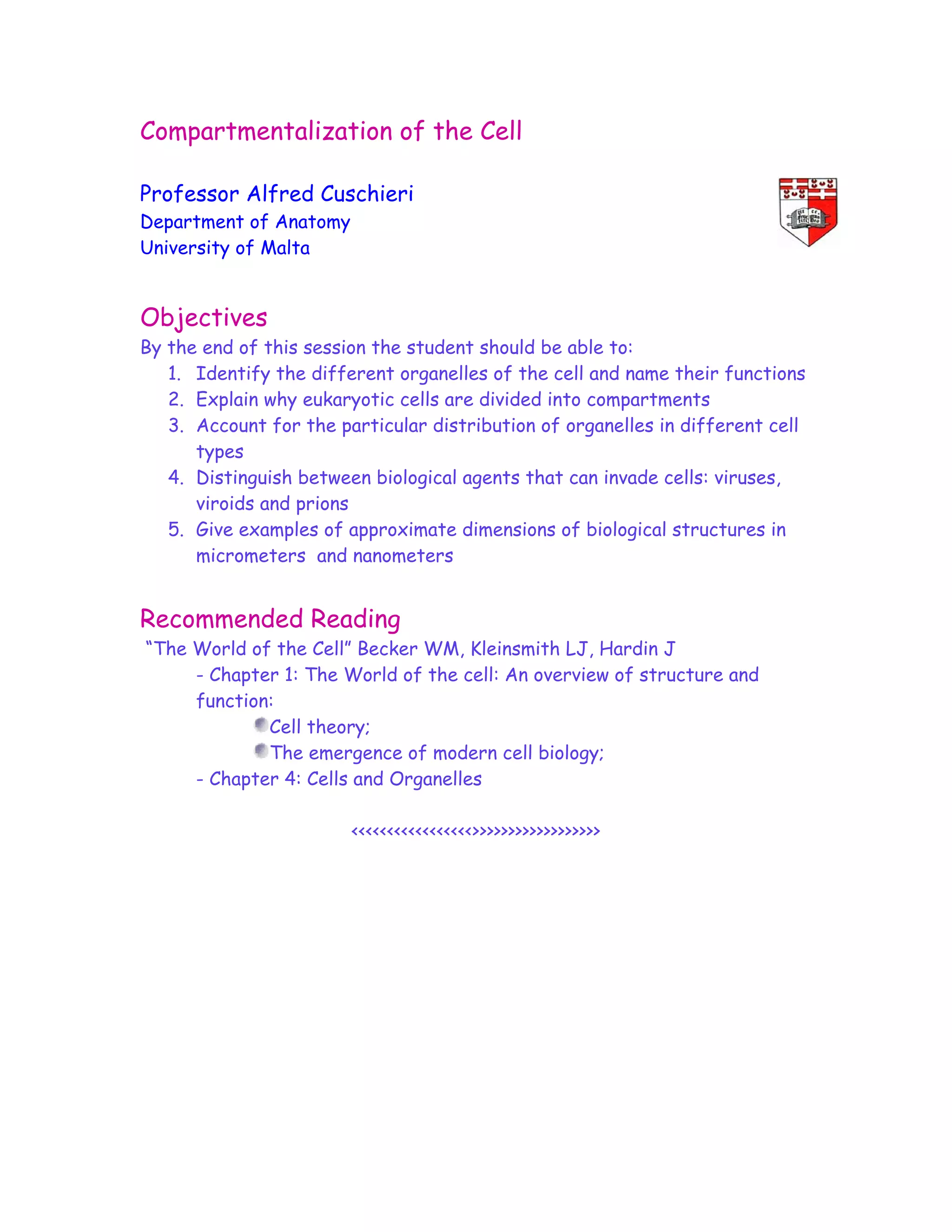 The document discusses the compartmentalization of eukaryotic cells. It explains that eukaryotic cells are divided into membrane-bound compartments, each with a specific structure and function. It provides examples of key organelles like the nucleus, mitochondria, endoplasmic reticulum, Golgi apparatus, and lysosomes. Compartmentalization allows cells to perform specialized functions and accommodate larger sizes. While prokaryotes like bacteria are not compartmentalized, eukaryotes compartmentalize to increase surface area and efficiency.