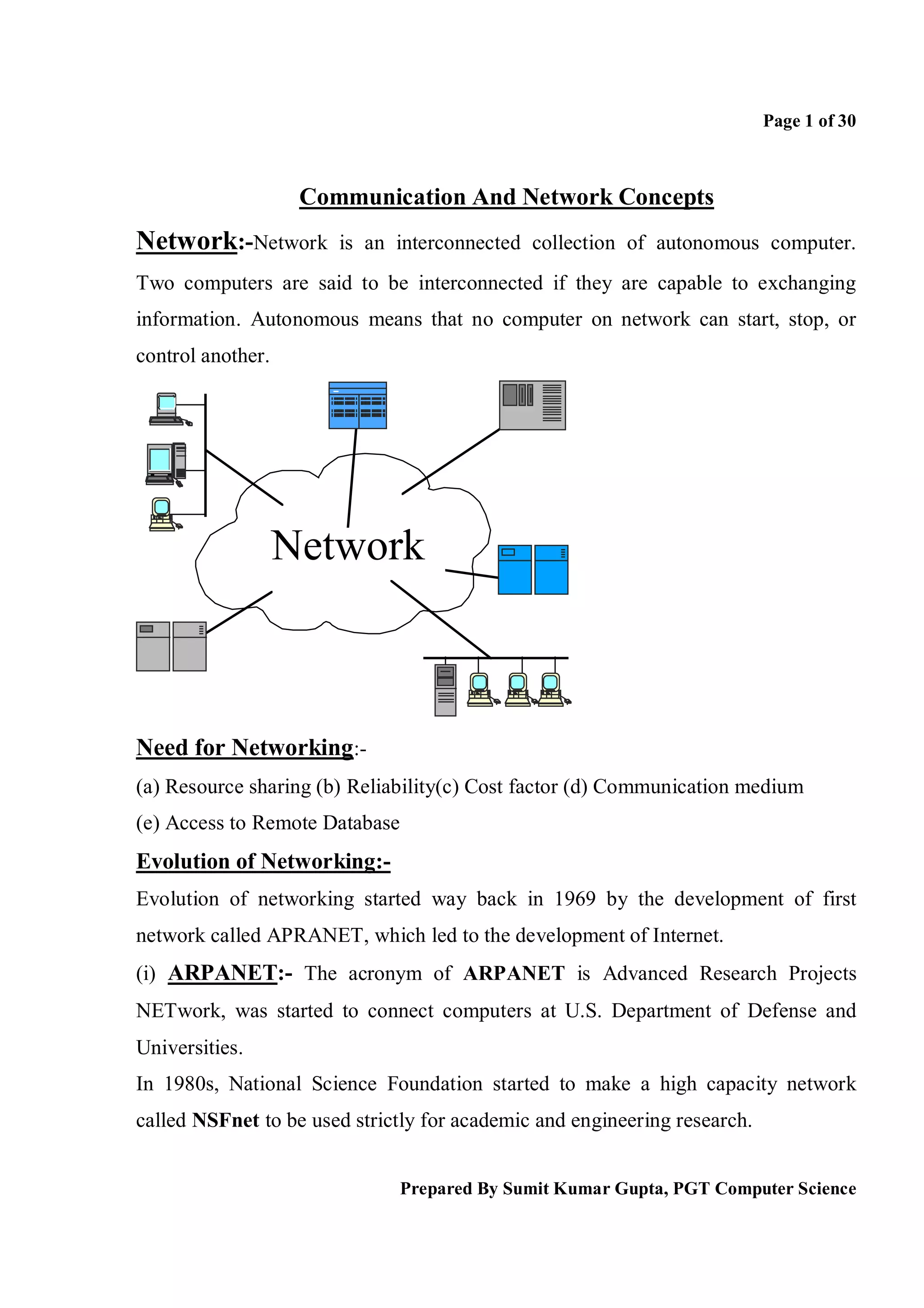 The document provides an overview of communication and network concepts. It discusses what a network is, the need for networking, and the evolution of networking from ARPANET in 1969 to the modern Internet. It also describes switching techniques, data communication terminology, transmission media including guided cables and unguided waves, common network devices, network topologies, types of networks including LANs and WANs, and protocols such as FTP and TCP/IP.