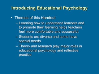 This document provides an overview of key concepts in educational psychology. It discusses how educational psychology aims to enhance teaching and learning by improving teachers' understanding of learners and promoting learning. It also notes that students are diverse and some have special needs. The document outlines concerns of beginning teachers, the importance of reflective teaching over technical teaching, recognizing diverse learners and students with special needs, and how educational psychologists use theory and research methods like descriptive, correlational, experimental, and action research.