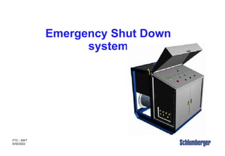 This document provides an overview of an emergency shut down (ESD) system. It outlines the objectives of understanding the ESD function, layout, and components. The ESD uses hydraulic actuators located on flow valves and surface safety valves to close quickly in an emergency. It must be used when well pressure is over 5,000 psi, H2S is present, or during high flowrate tests. The ESD panel includes hydraulic pumps, tanks, valves and pilots to activate valve closure from remote stations if pressure increases dangerously.