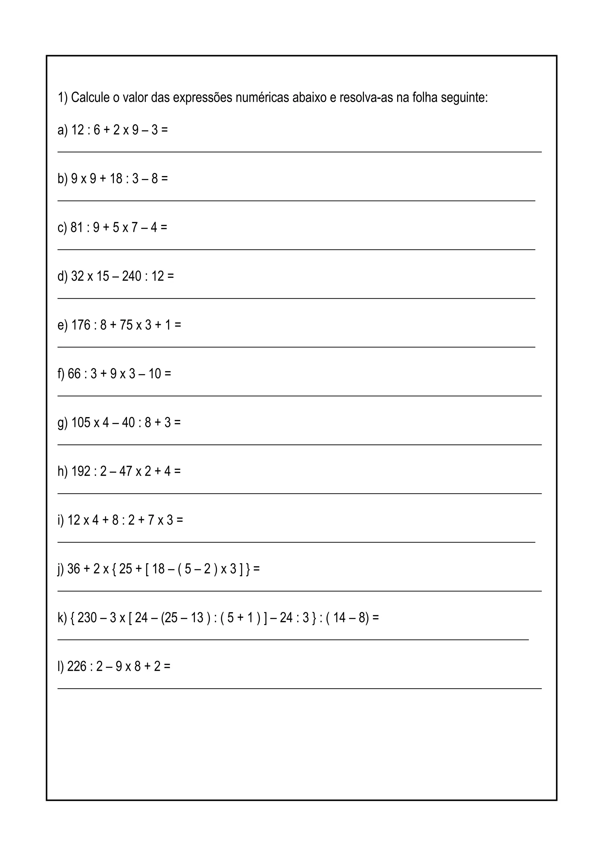 The document contains a series of mathematical expressions to be calculated and solved. There are 11 expressions involving operations like addition, subtraction, multiplication, division, and order of operations with parentheses and brackets. The task is to calculate the value of each expression and write the solution in the provided space.