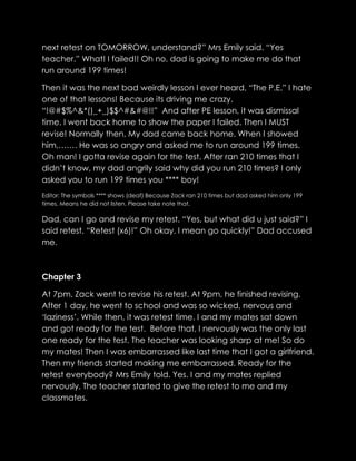Zack failed his science test and had to retake it. His dad punished him by making him run laps and study more for the retest. Zack was nervous to retake the test but studied hard. When he got the test back, he passed, making his dad and teacher proud. His dad rewarded him with a new guitar for passing.